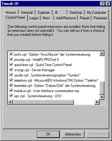 Was macht den Tweak-Ui wenn ich eine .cpl deaktiviere, ist nur das Symbol raus aus der Systemsteuereung oder direkt auch die entsprechende Windows-Funktion deaktiviert??? Ich würde mal sagen nur Symbol weg, ergo keine echte Hilfe für das Problem.