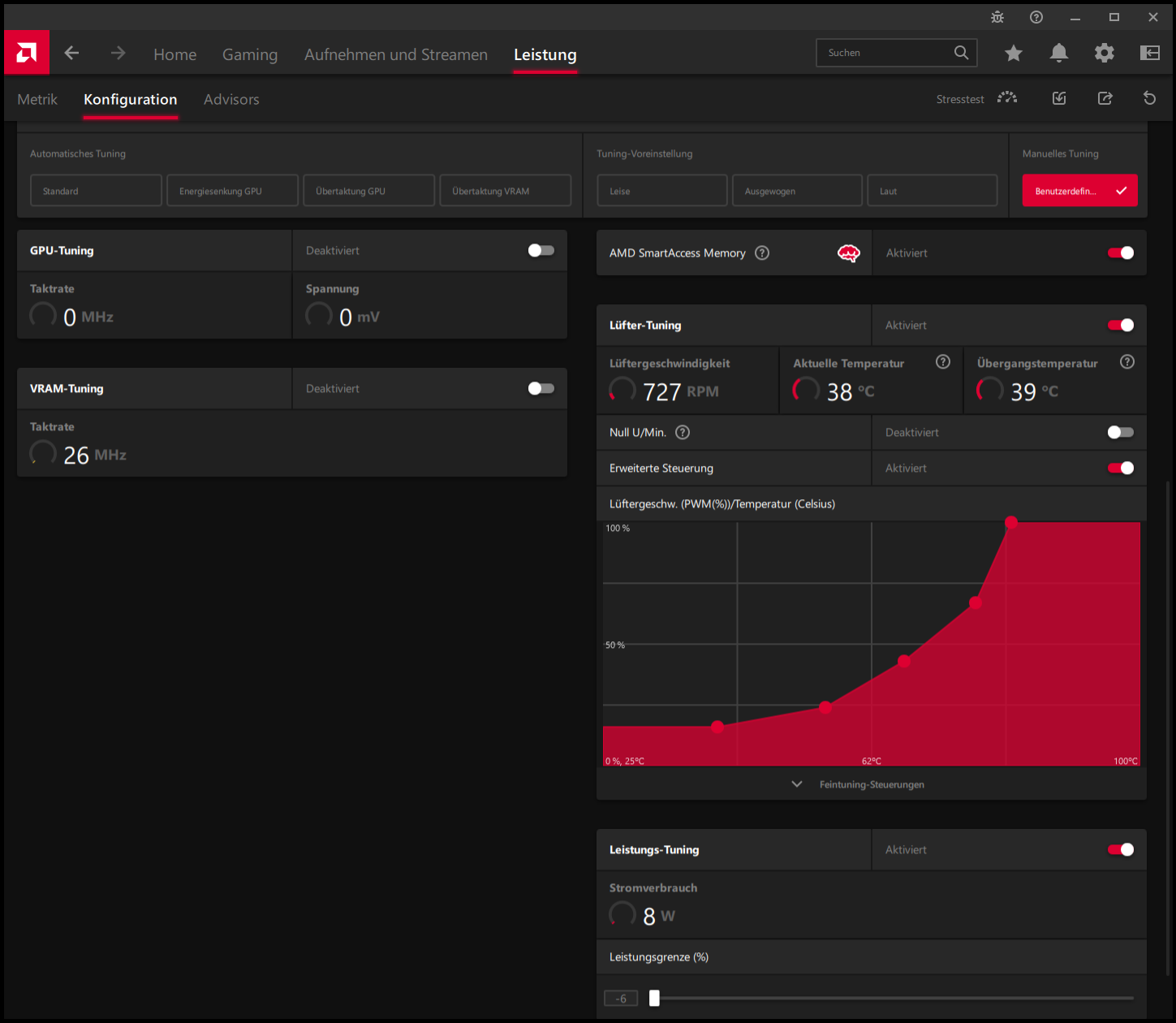 Dann stellste gerne nochmal Deine manuelle Lüfterkurve ein, wie in Deinem Screensot zu sehen. PL meinetwegen wieder auf minimum, also -6%. GPU und RAM Tuning einfach gar nichts.