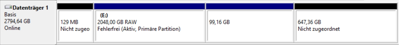 In Wirklichkeit sollten eine Parition mit 2,6 TB und eine mit 100 GB vorhanden sein.