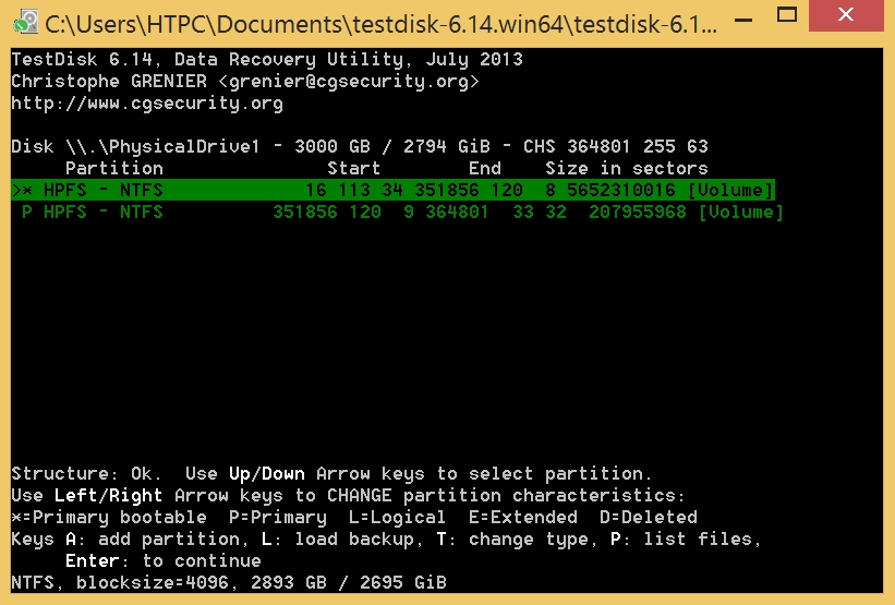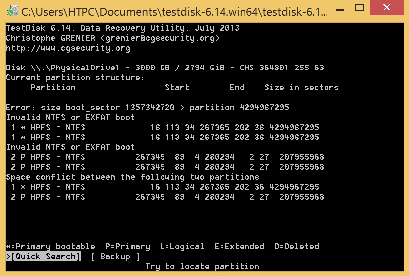 Ich habe also mal TestDisk gestartet und den Datenträger ausgewählt. TestDisk sieht schon, dass ein Partionskonflikt besteht (es zeigt meine zwei Partionen und die falschen an). Wenn ich die Analyse starte (Intel Partition, das schlägt TestDisk vor) werden Anfangs meine gesuchten Festplatten gefunden. Anschließend kann ich durch Druck auf "p" auch alle Dateien auflisten. Soweit also alles supi... Im Abschluss bietet TestDisk mir die Möglichkeit an die Partitionstabelle zu schreiben. Ich bestäge also mit "y" und erhalte sofort die Meldung, dass ich neustarten solle, damit die Änderungen wirksam werden. Ich mache also einen Neustart, doch es ändert sich leider gar nichts.