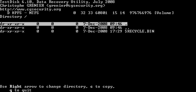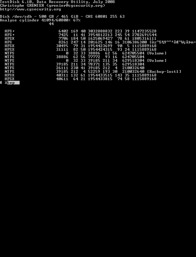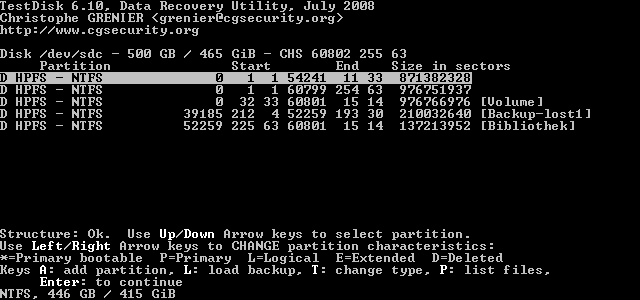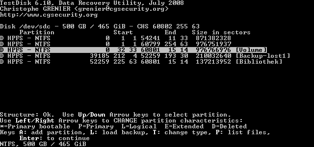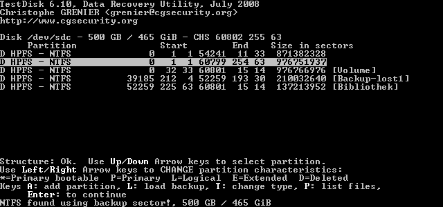 Testdisc ausgeführt. 1. Durchlauf keine (bzw. nur die ganze leere Platte) Partitionen gefunden. 2. Durchlauf (deepscann) wurden alle drei Partitionen gefunden + die Backup der MFT (?). Ich habe die 100 Gig Partition (laut Anleitung) wieder hergestellt (die war ja ursprünglich auch leer, also kein Problem).