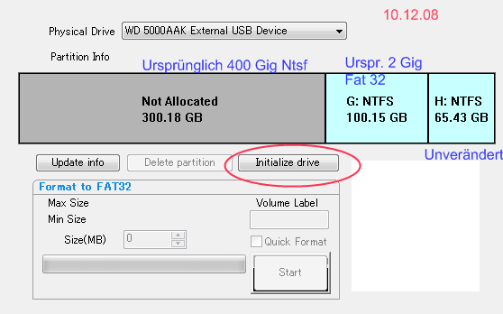 Ich habe eine 500 Gig externe Festplatte mit ursprünglich 3 Partitionen (2 NTFS + 1 Fat32). Ich wollte die FAT32 Partition mit ursprünglich 2 Gig auf 100 Gig vergrößern. Das war auch das kleinere Problem. Ich habe die Partition gelöscht. Eine der NTFS (ursprünglich 400 Gig) um 100 Gig verkleinert und dann den unpartitionierten Bereich partitioniert. Da es mir nicht möglich war (warum auch immer?) die 100 Gig direkt als FAT32 Partition zu erstellen, habe ich sie eben auch in NTFS erstellt. Daraufhin wollte ich diese mit dem Programm "FAT32Formatter" (vielleicht kennt ihr das ?) formatieren. Da ich nicht mit dem Programm zurecht gekomen bin habe ich aus versehen den Button "Initialize drive" geklickt. Und als ich auf meinen Arbeitsplatz schaue existiert nun plötzlich eine vollkommen leere 500 Gig NTSF Partition (schei...!!!).