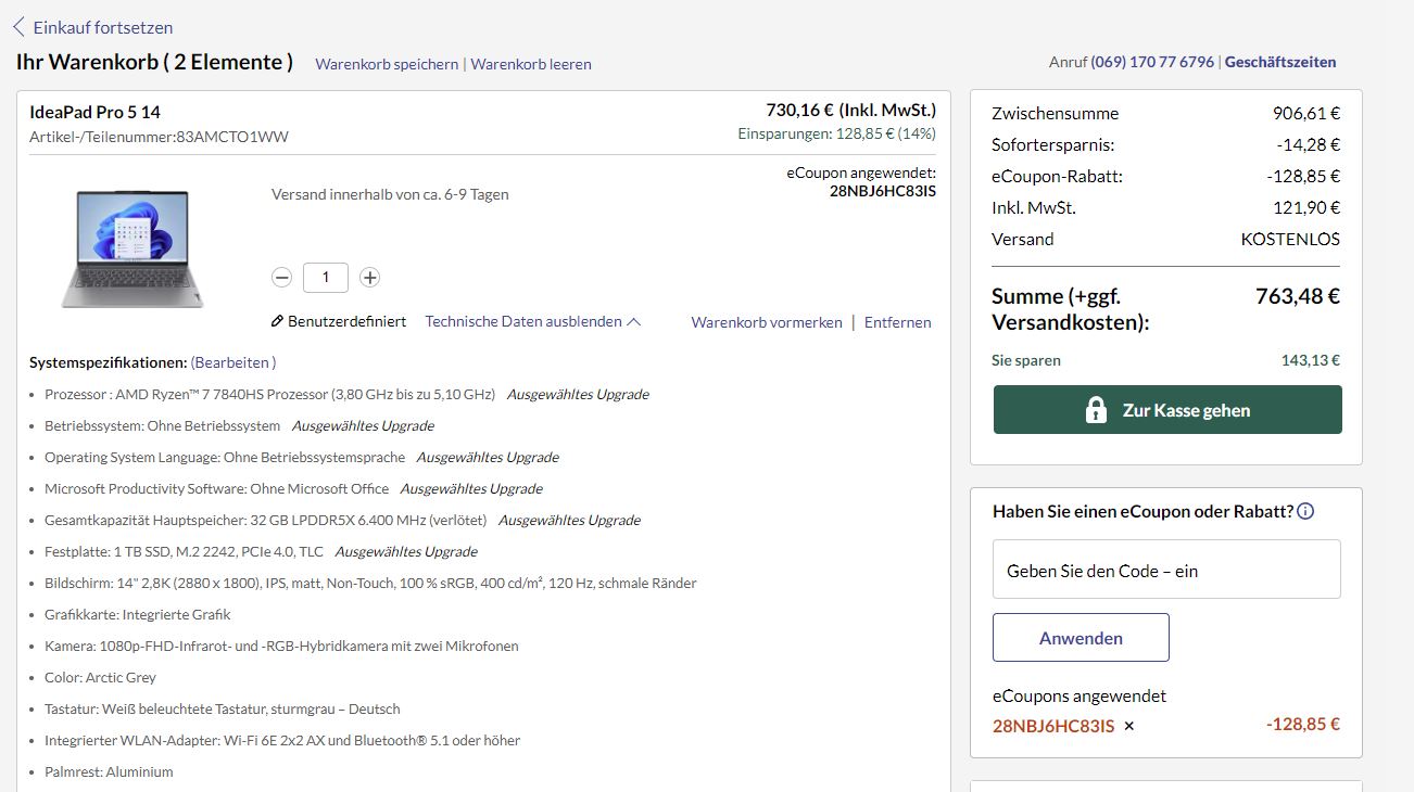 - Bildschirm: 14" 2,8K (2880 x 1800), IPS, matt, Non-Touch, 100 % sRGB, 400 cd/m², 120 Hz, schmale Ränder