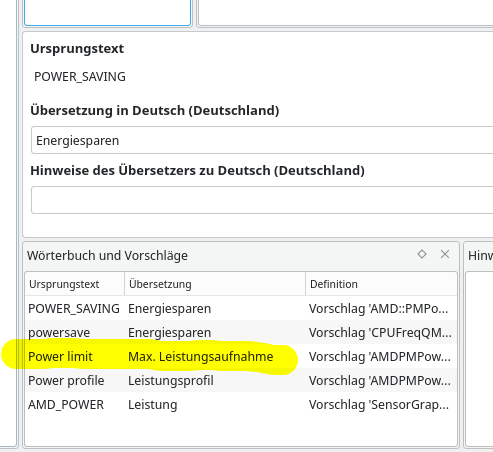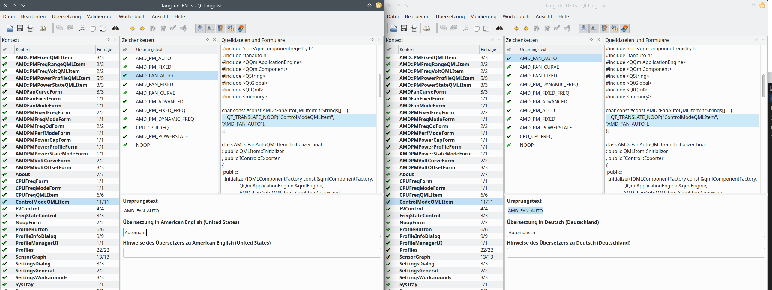 AMD_FAN_AUTO, deren eigentlicher Sinn sich erst nach Blick in die englische Originaldatei erschließt (hier: Automatic); die DE-Übersetzung lautet dann Automatisch (siehe Screenshot).Für die Übersetzung habe ich Qt Linguist verwendet (sollte in den Repos eurer Distro enthalten sein, zwecks Lektorat). Der Aufwand hält sich mit insgesamt 320 Wörtern in Grenzen. Der oft benötigte Vergleich zur englischen Originaldatei macht das Ganze bisweilen jedoch zäh.