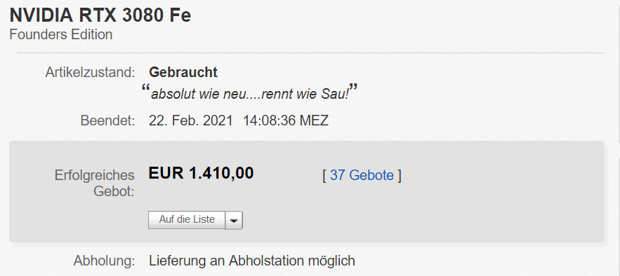 Deutlich über 3000 Euro für eine RTX 3090, glatte 2000 Euro für eine RTX 3080 und über 1300 Euro für eine RTX 3070 - diese Zahlen stehen für sich und benötigen keinerlei weiteren Kommentar.