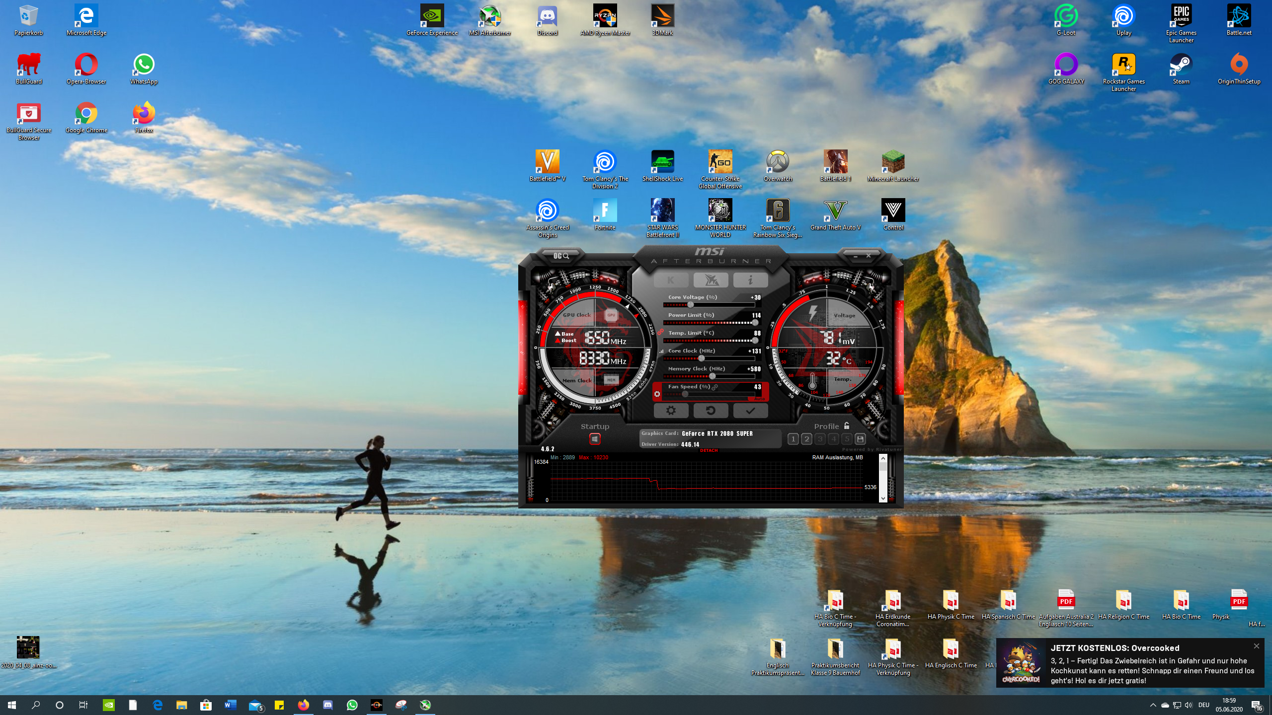 In Battlefield 1 ist die Graka zu 95-98% ausgelastet während die CPU bei 40% ausgelastet ist. Dies ist bei den höchsten Settings in WQHD mit 60-80 fps was für eine RTX 2080 Super Gaming X Trio ein bisschen zu schlecht ist.