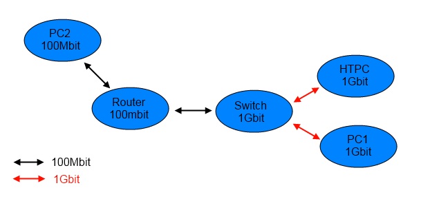 Zur Übersicht nochmal der Netzwerkaufbau: PC1 ist meiner (Gbit onBoard), PC2 der von meinem Bruder, HTPC (Gbit onBoard), Router ist nen Linksys WRT54G (100Mbit) und Switch nen Dlink 1005D (1Gbit)