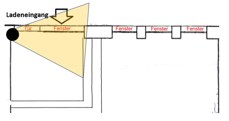 Die Kamera könnte im Büro oberhalb der Tür installiert werden und nach unten gerichtet sein, so dass erkannt wird, wenn jemand durch die Tür oder das 1. Fenster kommt (die anderen 3 Fenster sind erhöht und daher weniger interessant zur Überwachung).