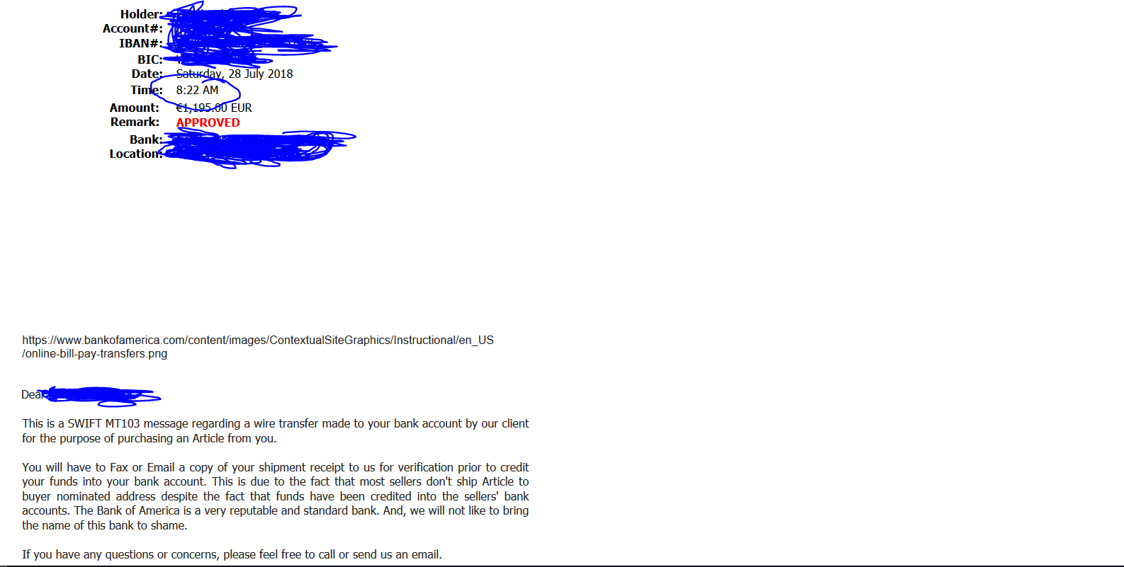 Ich verkaufe aktuell meinen Alienware Laptop. Eingestellt bei Ebay und Kleinanzeigen. Habe dann eine Nachricht aus Amerika bekommen, die an diesem Laptop interessiert ist. Der Laptop soll allerdings für Ihren Freund aus England dienen. Dem entsprechend habe ich ein Anschreiben dafür bekommen. Bezahlt wird halt aber per Banküberweisung aus Amerika. Ich bin jetzt etwas skeptisch. Ich habe heute morgen eine Mail von der Bank of America bekommen: