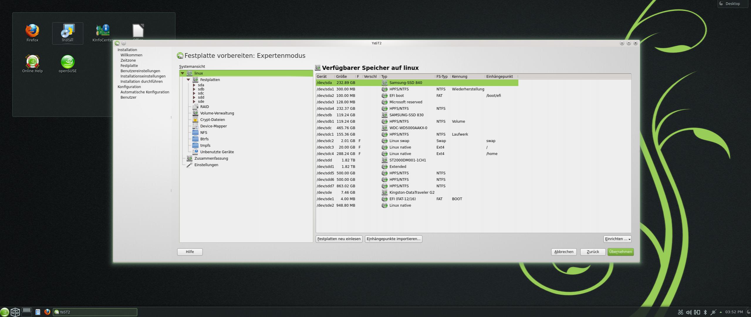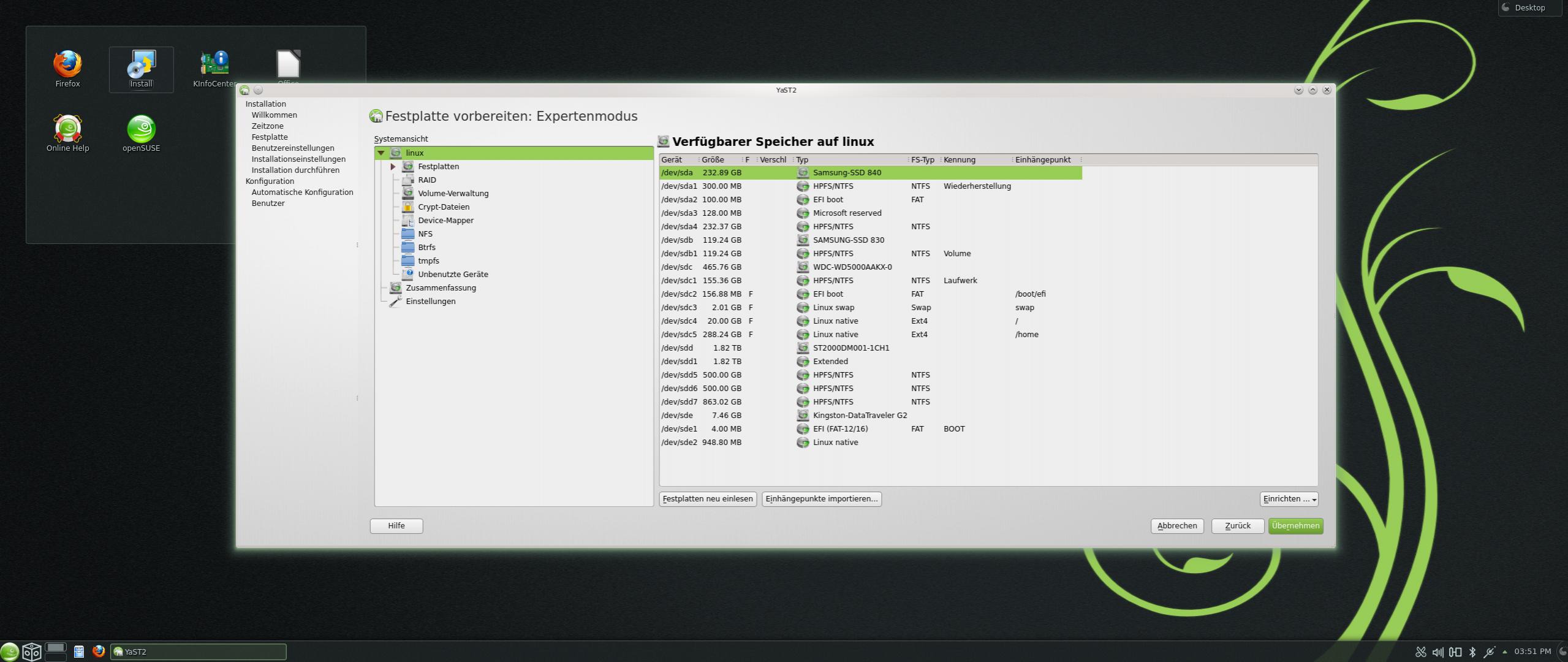 Also bei der Installation, schlägt openSuse mir die richtige Festplatte vor, welche ich vorher leer geräumt hatte. Passt alles so, allerdings will es nochmal eine EFI Partition erstellen, welche ja allerdings schon auf der ersten Festplatte für Windows besteht.