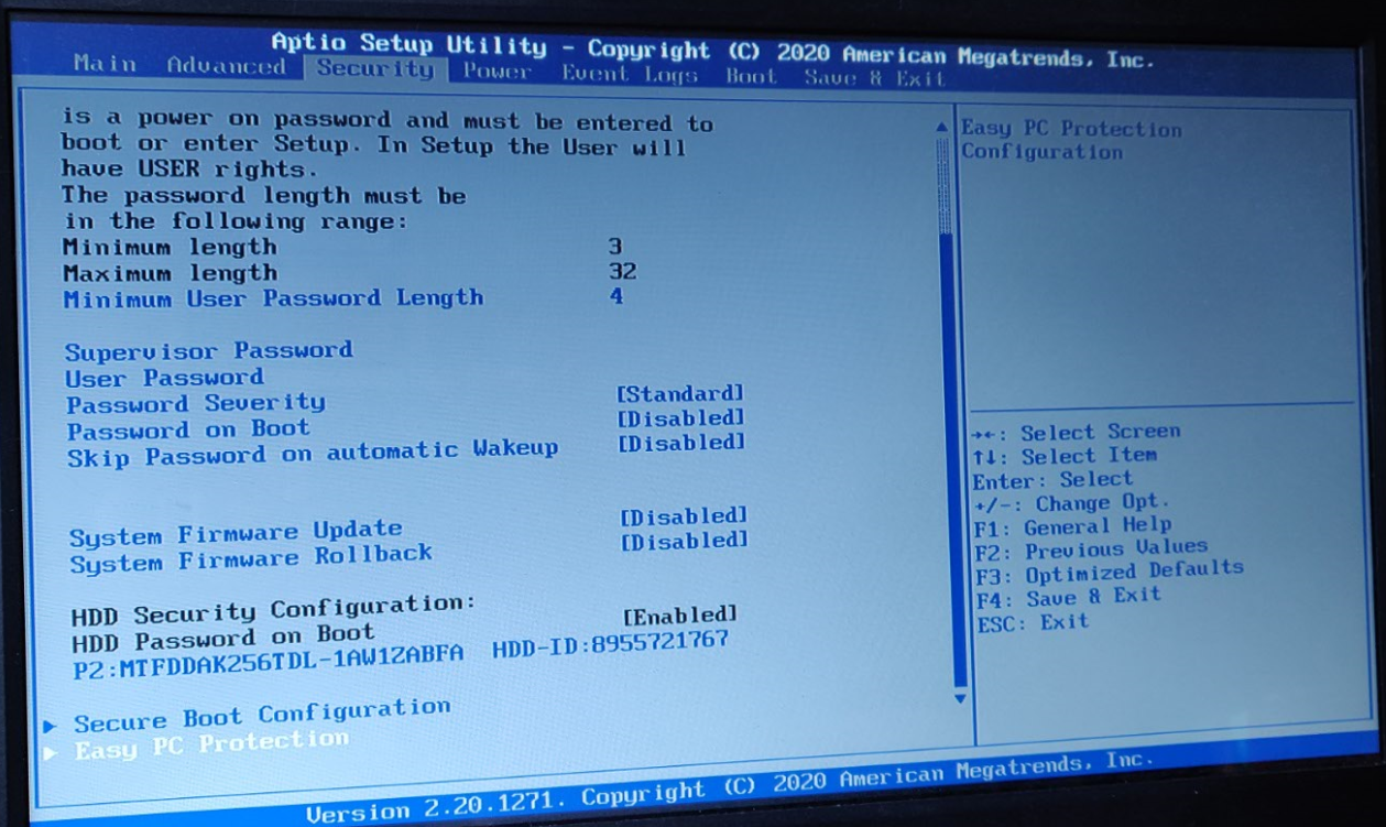 Die einzige Einstellung dahingehend ist "Secure Boot", welche deaktiviert ist. Auch die Boot-Reihenfolge erscheint mir seltsam; dort kann nur zwischen zwei Controllern gewählt werden, nicht aber die Festplatten selbst. Die Festplatte wird allerdings erkannt, siehe Screenshot vom Reiter "Security".