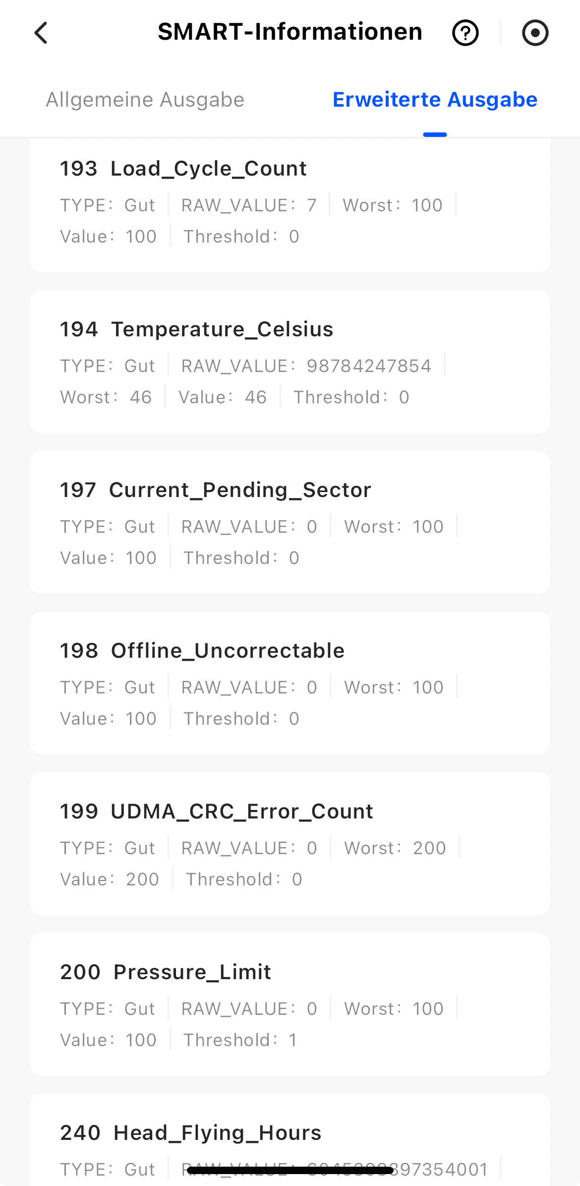 @andur63 Bei Seagate ist das normal. Die zählen da anders. Entscheidend ist der Rohwert, den man hier nicht sieht. @egitoni Du könntest mal schauen, ob der über "erweitert" angezeigt wird.