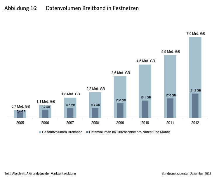 Die Bundesnetzagentur gab für 2012 etwa 21GB an. (Seite 37 in der PDF-Datei)Anwalt Dr.Gonzo schrieb:Wo liegt momentan der durchschnittliche erzeugte Traffic eines Internetanschlusses in Deutschland? Ich tippe mal auf einen Bereich in der Größenordnung von 5-20 GB pro Monat.