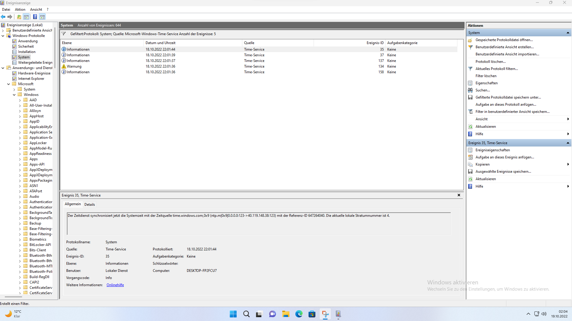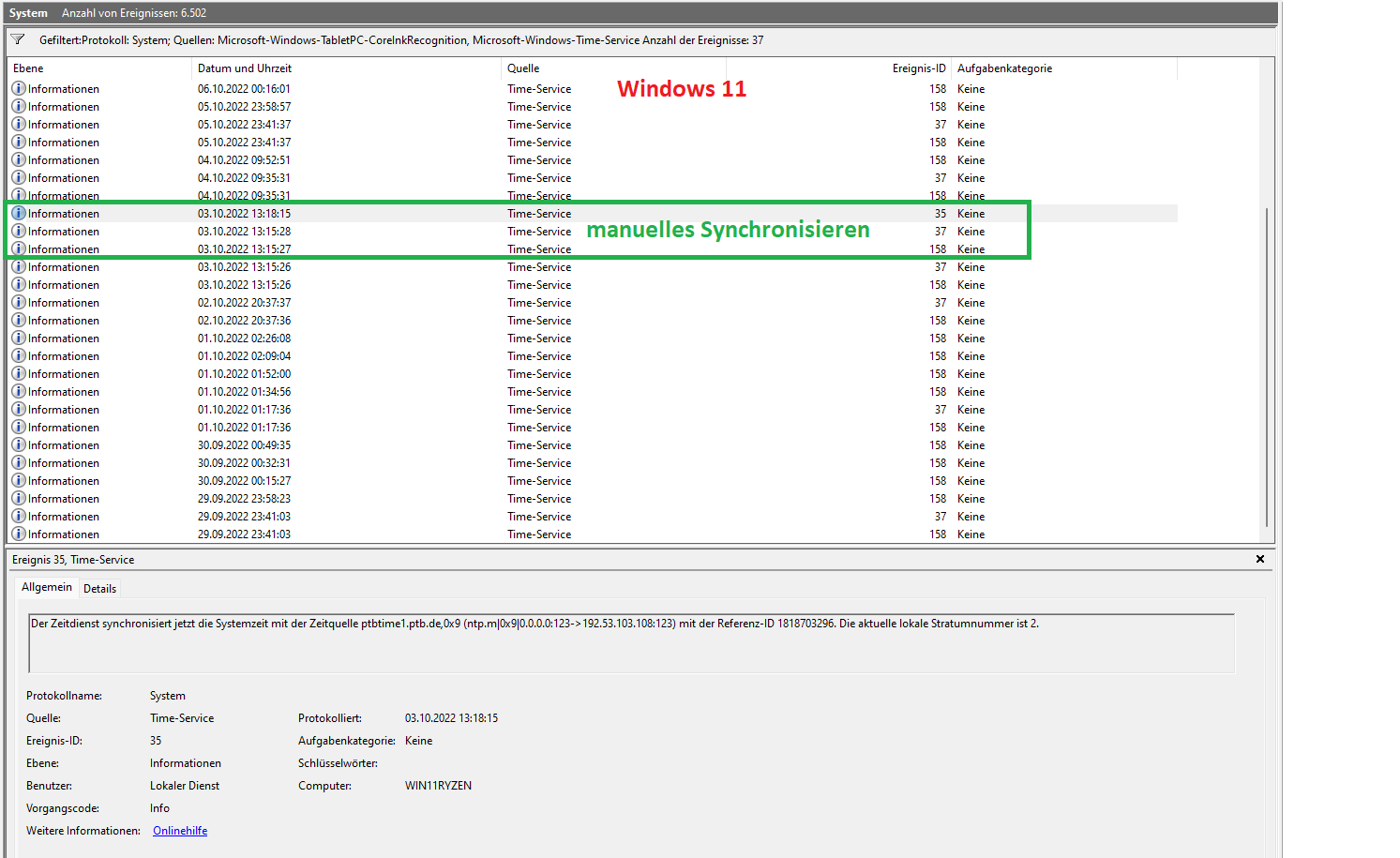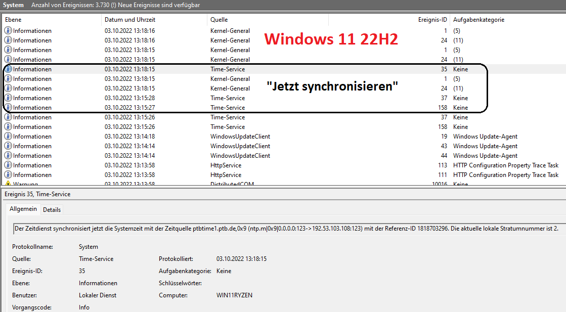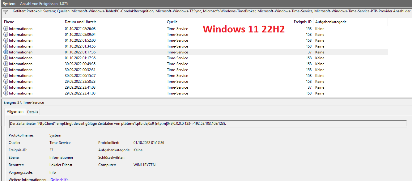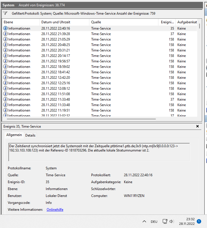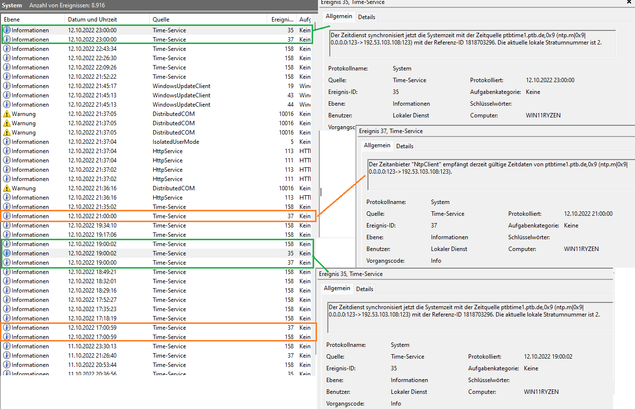 Die Ereignisanzeige gibt nichts darüber her, was die Um- oder Rück-Stellung der Uhrzeit über Windows, oder irgendwas anderes, angeht? Beispiele: