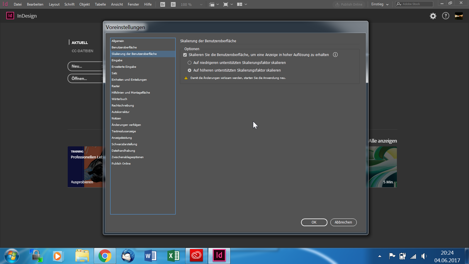 ich möchte mein InDesign CC 2017 auf einem High-DPI-Bildschirm nutzen (Windows 7, DPI auf 150 %), jedoch skalieren die Menüs trotz aktivierter Funktion nicht. Illustrator zeigt das gleiche Problem, Photoshop geht immerhin auf die 200 %.