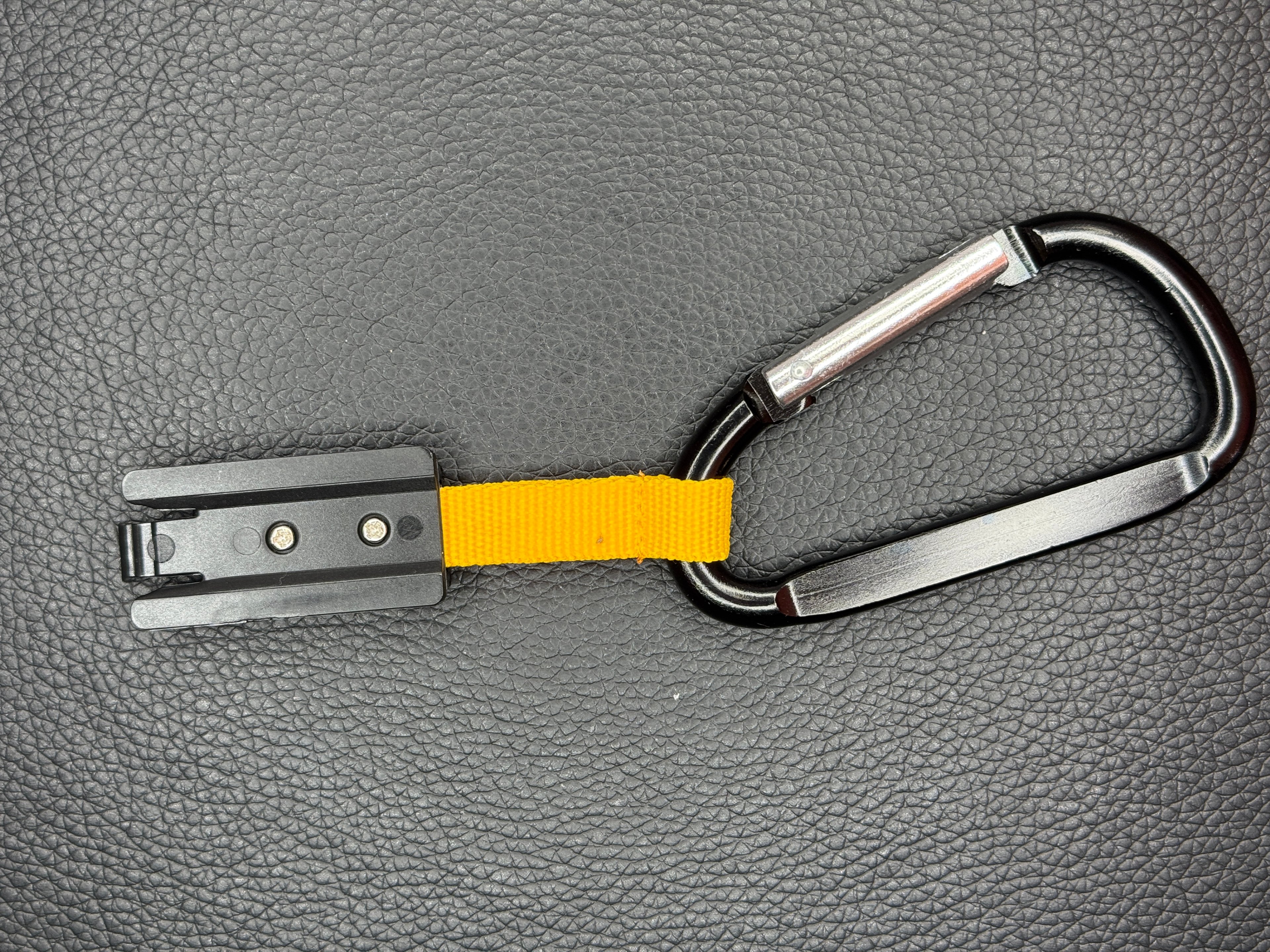 Dieser Karabiner mit Befestigung für die Schutzuhülle wird euch ebenfalls mitgeliefert. Auch dieser wird in die Hülle geschoben, bis es "klickt".