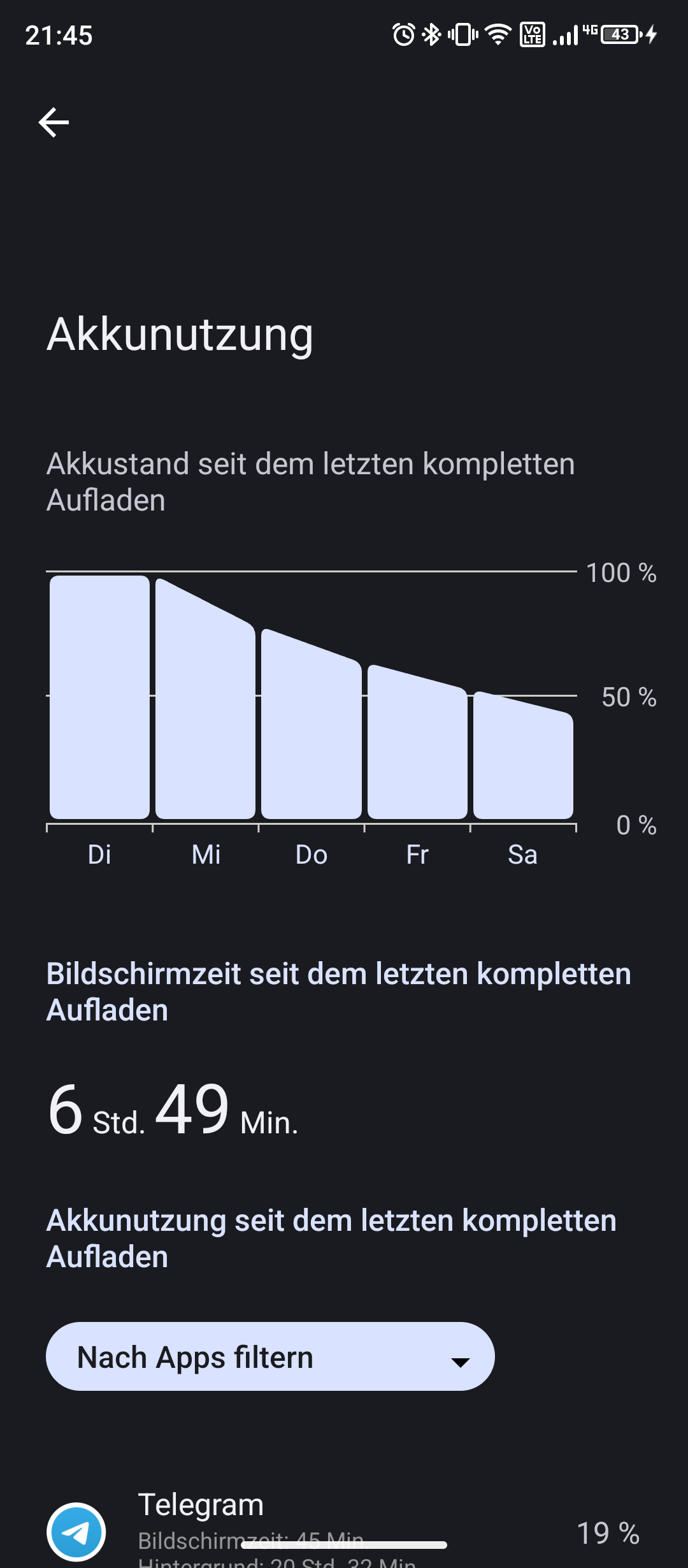 Wie ihr sehen könnt, bin ich bei 6 Std. und 49 Min. mit einer Restkapazität von 43%.