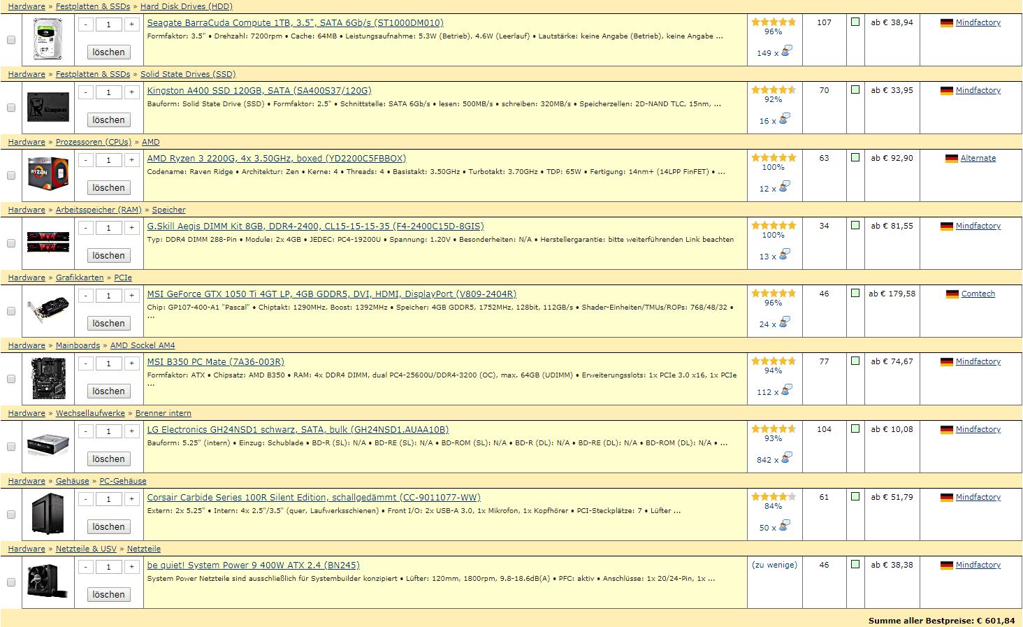 Gesamtpreis 601,84 €, zzgl. fehlende SATA Kabel, Betriebssystem, Monitor, Maus, Tastatur und evtl. Lüfter.