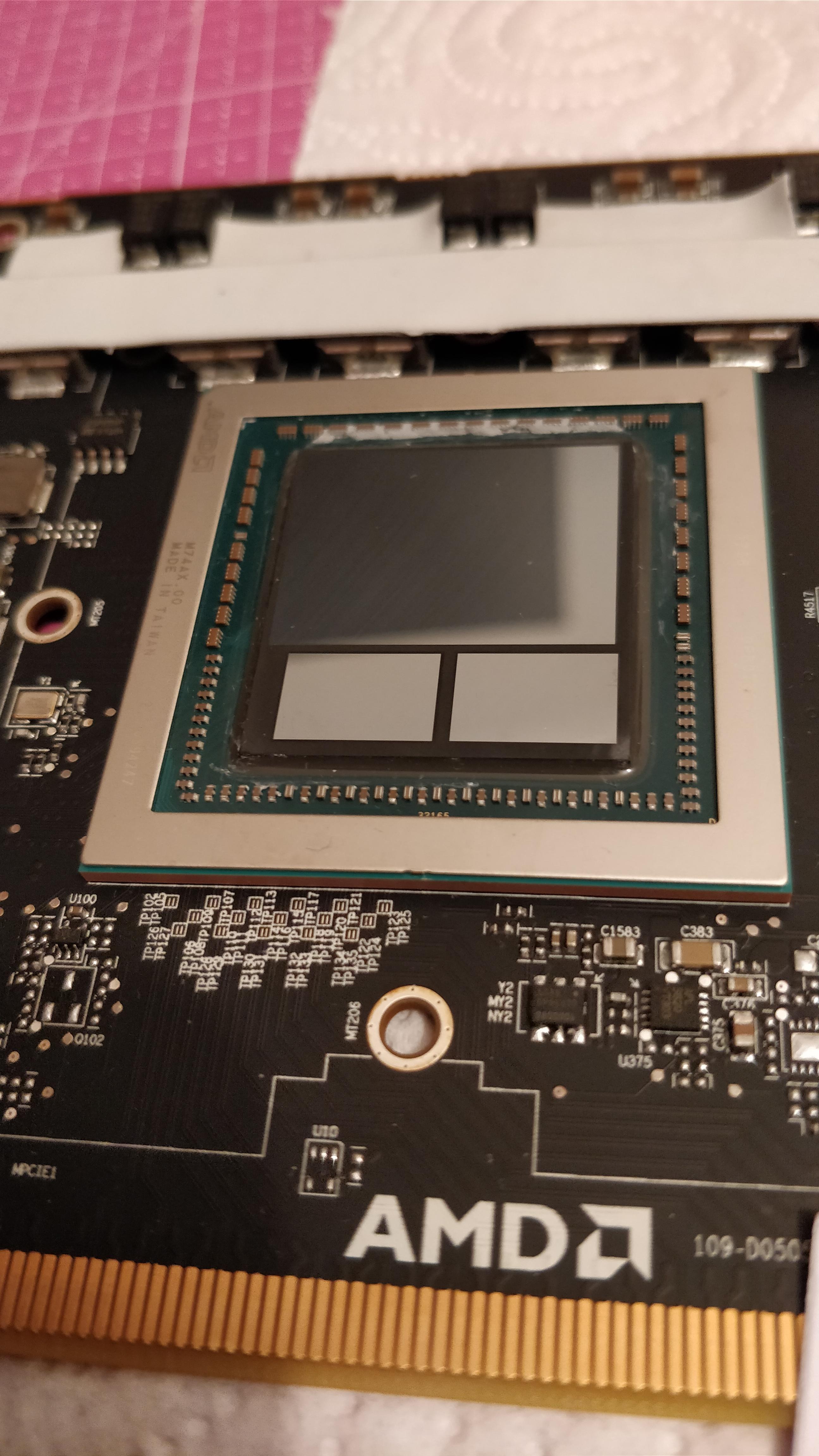 HBM2 und GPU sind nicht beschriftet. Der Übergang ist ziemlich eben und von schwarzen irgendwas unterstützt.