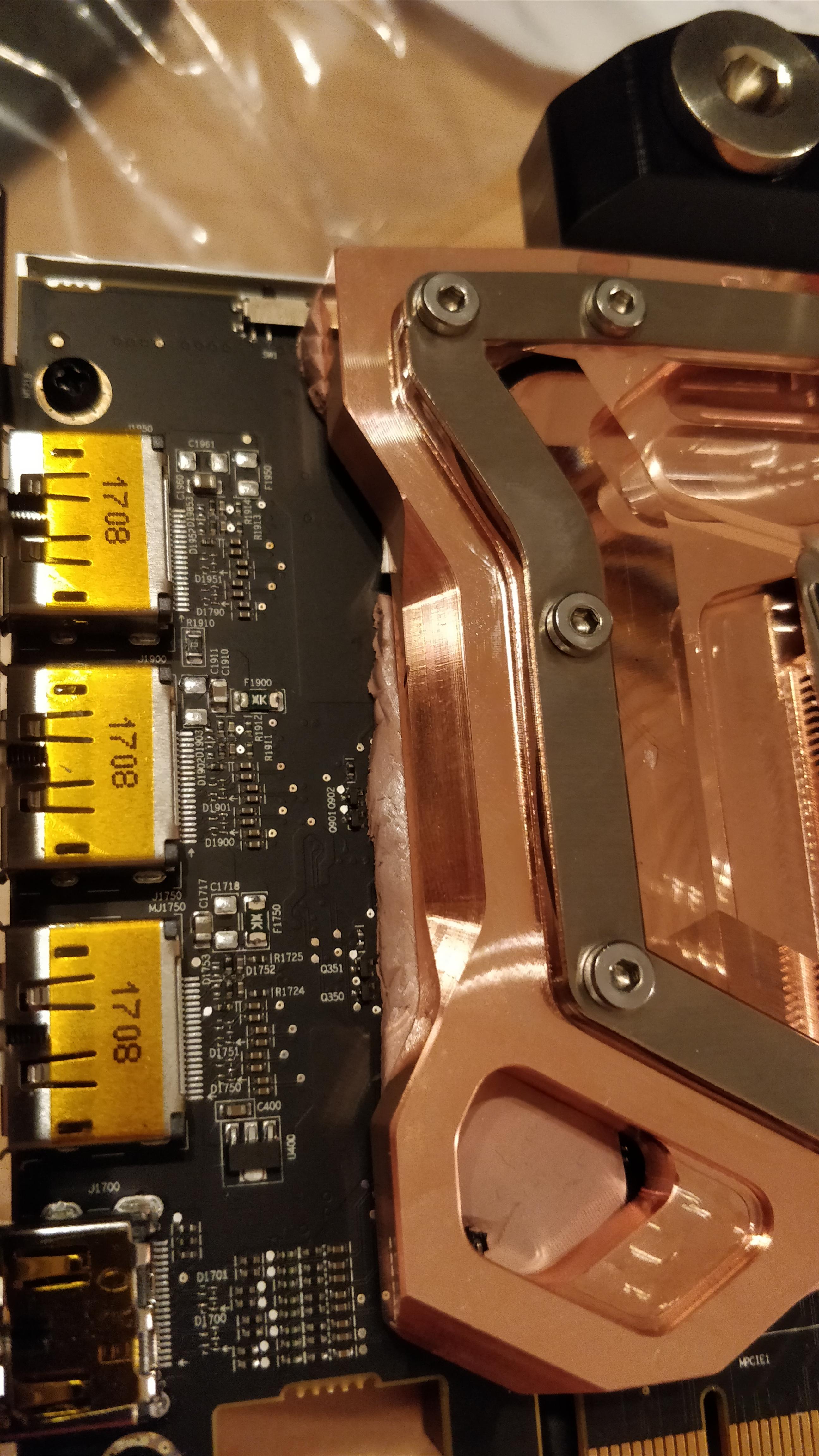 Wie man sieht, habe ich die beiden Spulen links(ich schätze, die sorgen schonmal für eine Vorreduzierung der Spannung um die Effizienz zu steigern) rundum eingepackt. Ich mache mir leichte Sorgen um die Kühlung aber dafür bekommen sie auf der anderen PCB Seite einen Kontakt zur Backplate.