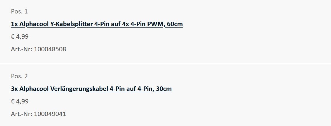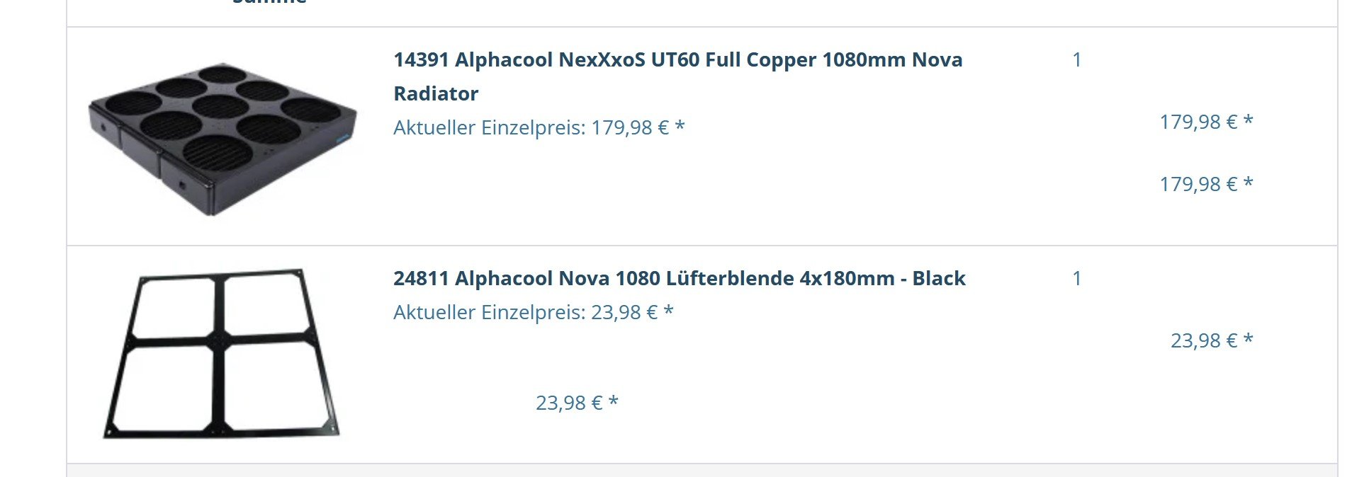 Ja meine Liste dient als Anhalt was du alles beim Kauf beachten musst, trozdem würde dir empfehlen mal alle Möglichkeiten anzuschauen und dann erst zu bestellen. Wenn es zusätzlich ein anderes Gehäuse sein soll, dann würde ich damit beginnen. Wenn du einen externen Radiator planst, dann kannst du ein kleineres Gehäuse wählen. Bei internen Radiatoren empfehle ich dir, ein Gehäuse mit 3x 360 Radiatoren, ich merke bei mir das 2x 360 und 1x 120 ziemlich knapp bemessen sind. Dann mach dir noch Gedanken, wo welche Komponente im System verbaut werden soll und wie die Schlauchführung aus schauen soll. Davon ist abhängig ob du 90° Fittings, oder normale benötigst. Beim Radiator kann ich sagen, der Nexxos ist gut, aber kein Vergleich zu einem MoRa, kostet aber halt auch nur die Hälfte. Beim MoRa kannst du 4x 20cm Lüfter verbauen, beim Nexxos benötigst du 9x 120cm.