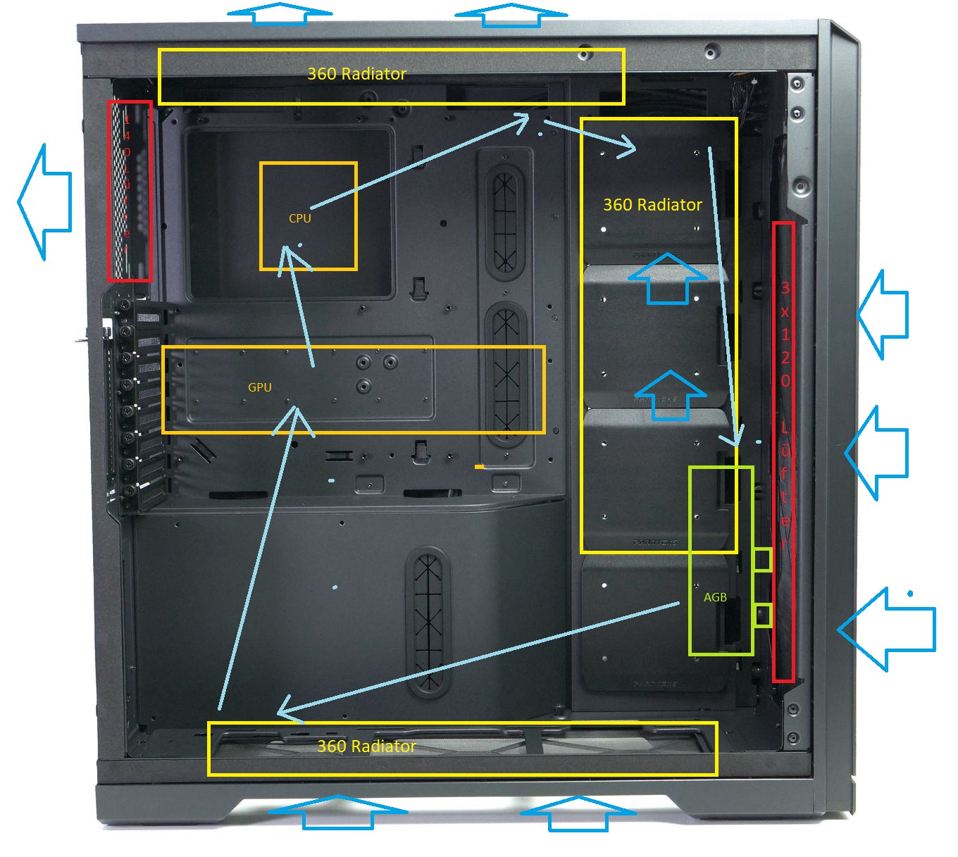 Sollte eigentlich so funktionieren oder ? Mir ist natürlich bewusst das es besser ist wenn die 3 Radiatoren alle Frischluft bekommen, aber vorne ausblasend möchte ich keine Lüfter montiert haben. Als Alternative hätte ich noch den seitlichen Radiator vorne einzubauen und einblasend zu montieren. Und dafür die 3 120er Lüfter seitlich ausblasend zu montieren. Allerdings muss in die Front die Halterung für den AGB sowie der AGB.