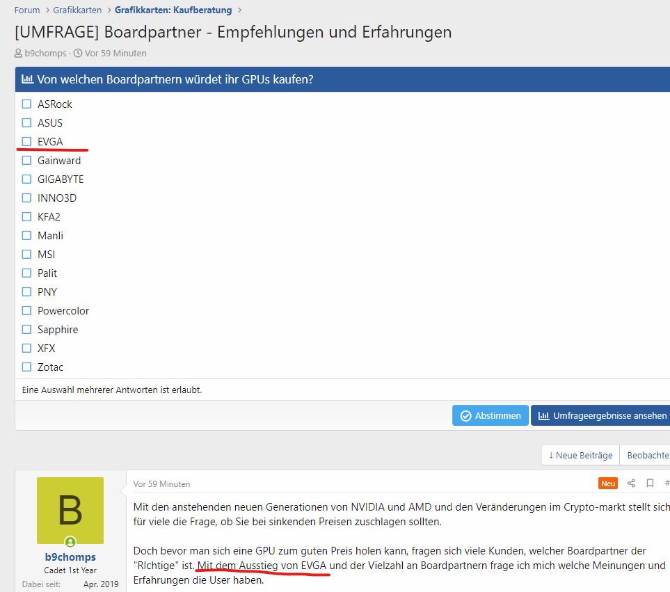 Doch bevor man sich eine GPU zum guten Preis holen kann, fragen sich viele Kunden, welcher Boardpartner der "RIchtige" ist. Mit dem Ausstieg von EVGA und der Vielzahl an Boardpartnern frage ich mich welche Meinungen und Erfahrungen die User haben.