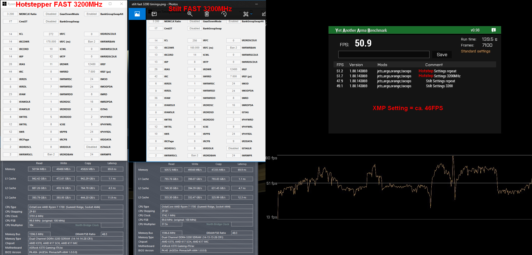 Kurzum, in der angehaengten Grafik findet ihr Settings die in Aida64 gleich schnell sind wie die Stilt Settings fuer 3200MHz Samsung B Module, aber zumindest bei mir problemlos mit 1.4V stabil laufen und in-Game (ArmA3) reproduzierbar schneller sind als die Stilt settings.