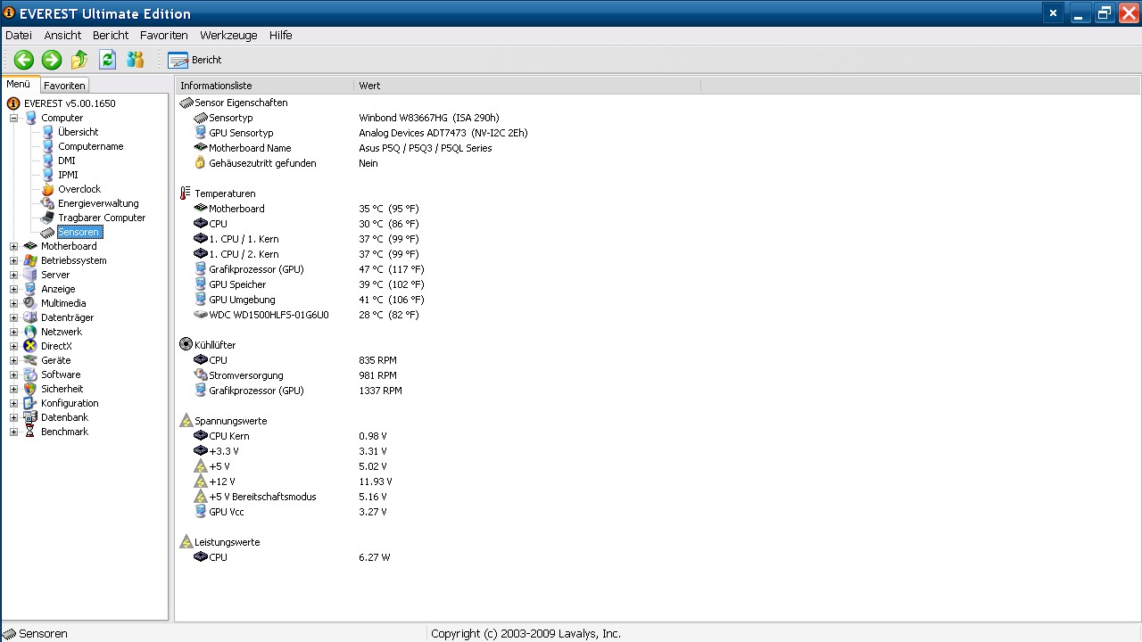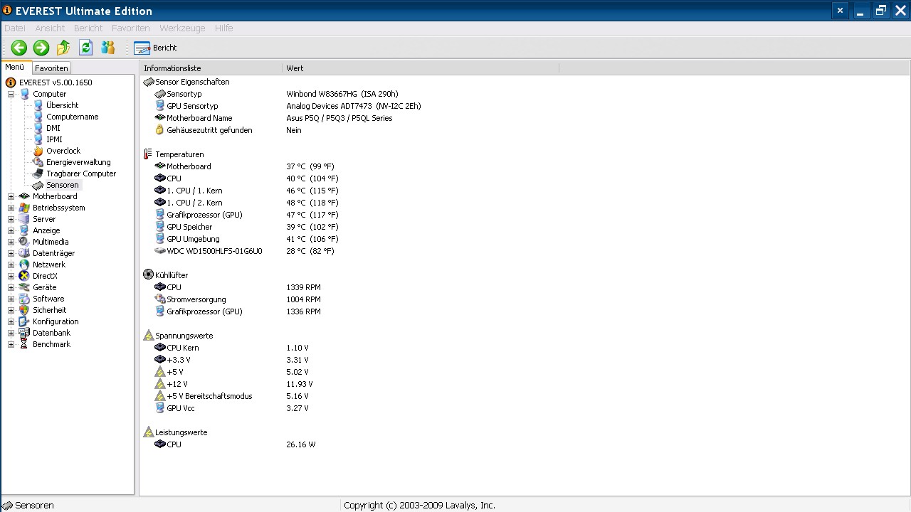 CPU Q9550: leer30°C und last 46°C