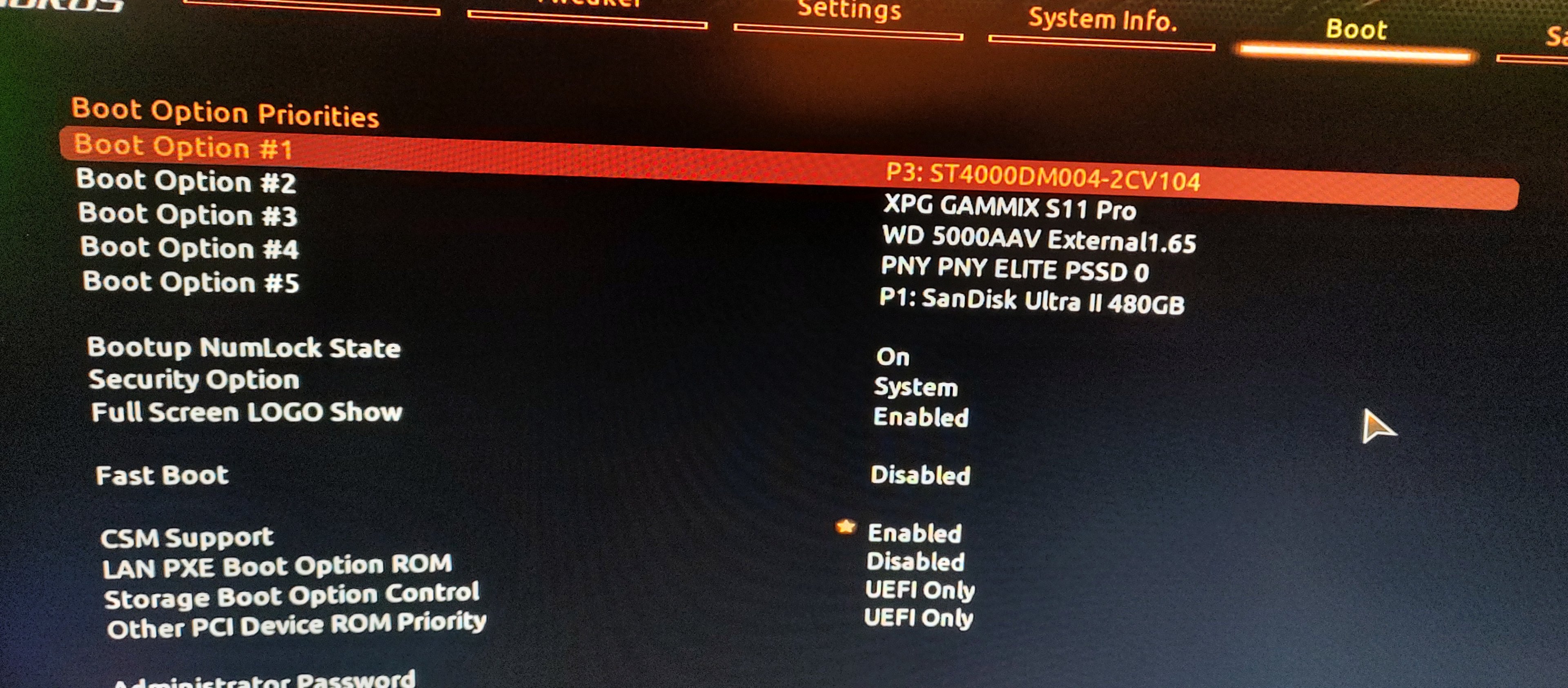 Wenn das Win 10 ist muß die an Platz 1. Also bei Boot Option 1 mit Enter die Platten aufrufen und die Sandisk wählen.Marcian schrieb:So ist die Reihenfolge. Boot 5 ist die Windows SSD......hm