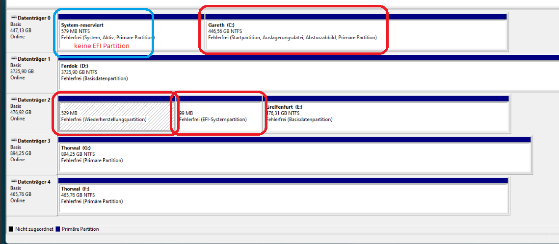 Auf dem Holzweg ist mir in #8 Bild aufgefallen, dass Bootmanager und Wiederherstellungsdatei auf Datenträger 2 sind.Marcian schrieb:Auf Datenträger 0