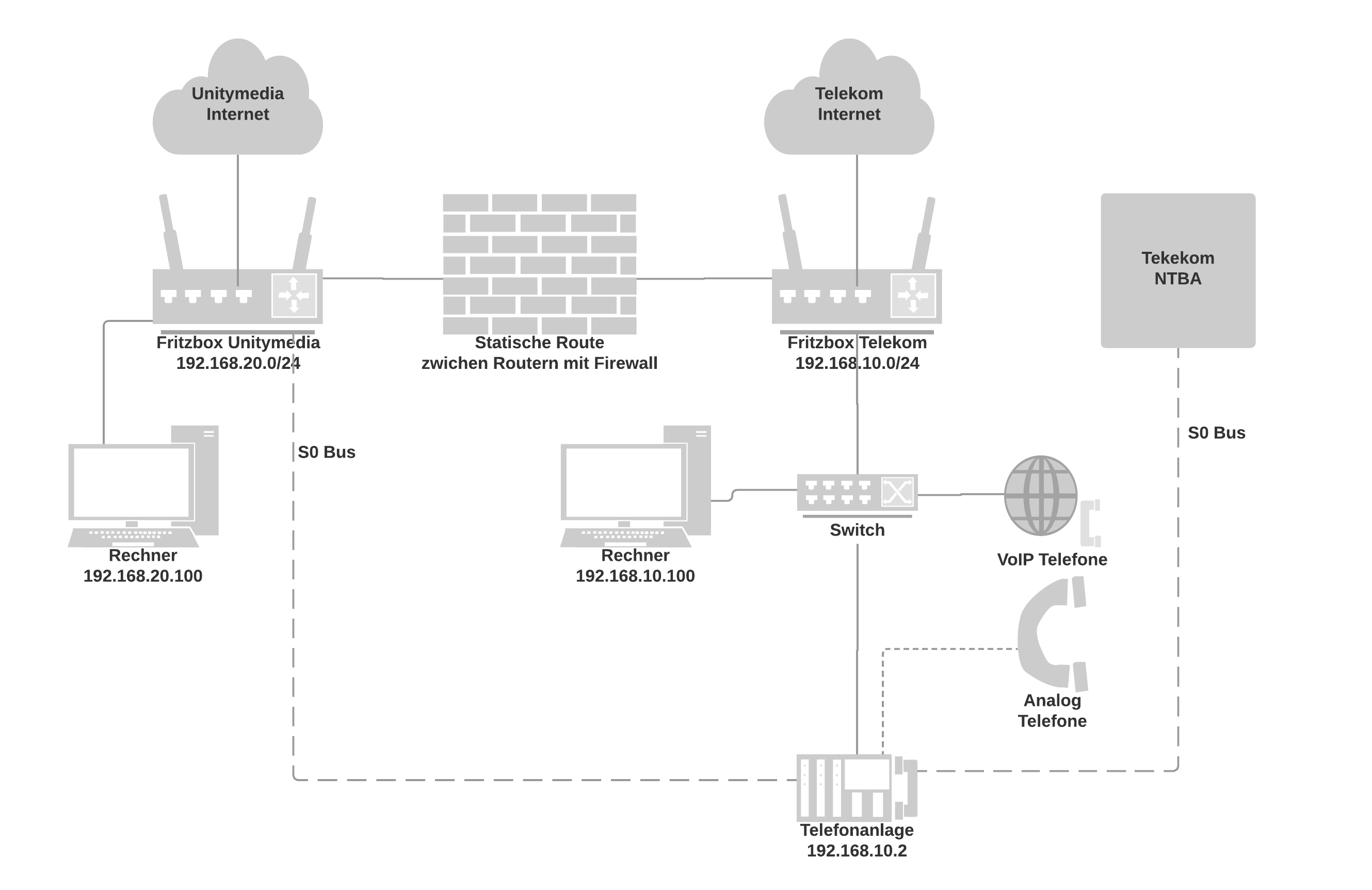 Die Telefonanlage hängt im "Telekom Netz" und ist über zwei S0 Leitungen mit Telekom NTBA und Unitymedia Fritzbox verbunden.