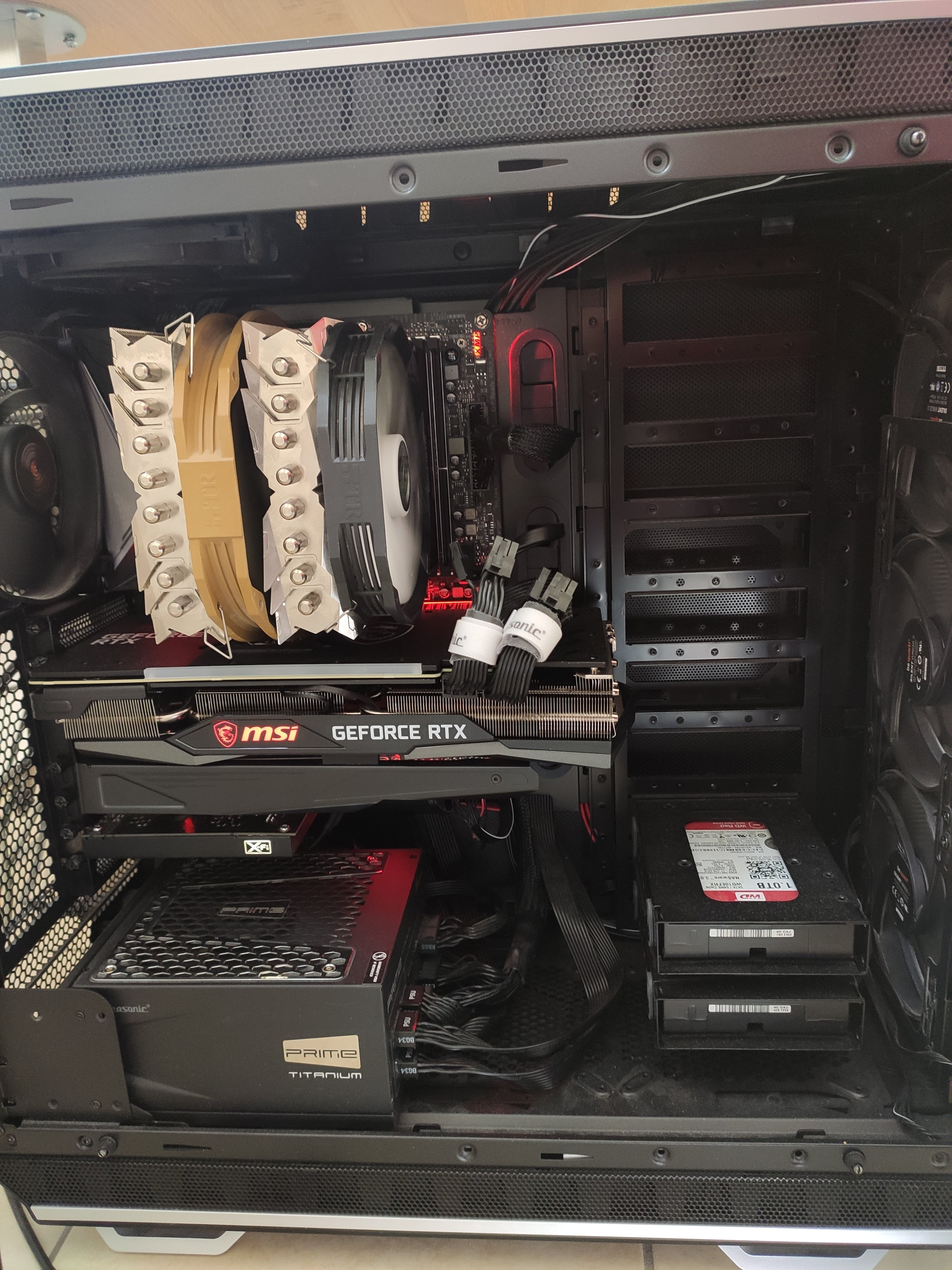 Die hinteren "roten" Lüfter drehen immer schneller als die Front, ich versuche so einen Unterdruck zu erzeugen. Die GPU (2080 Ti) ist nicht übertaktet aber auch nicht undervoltet.