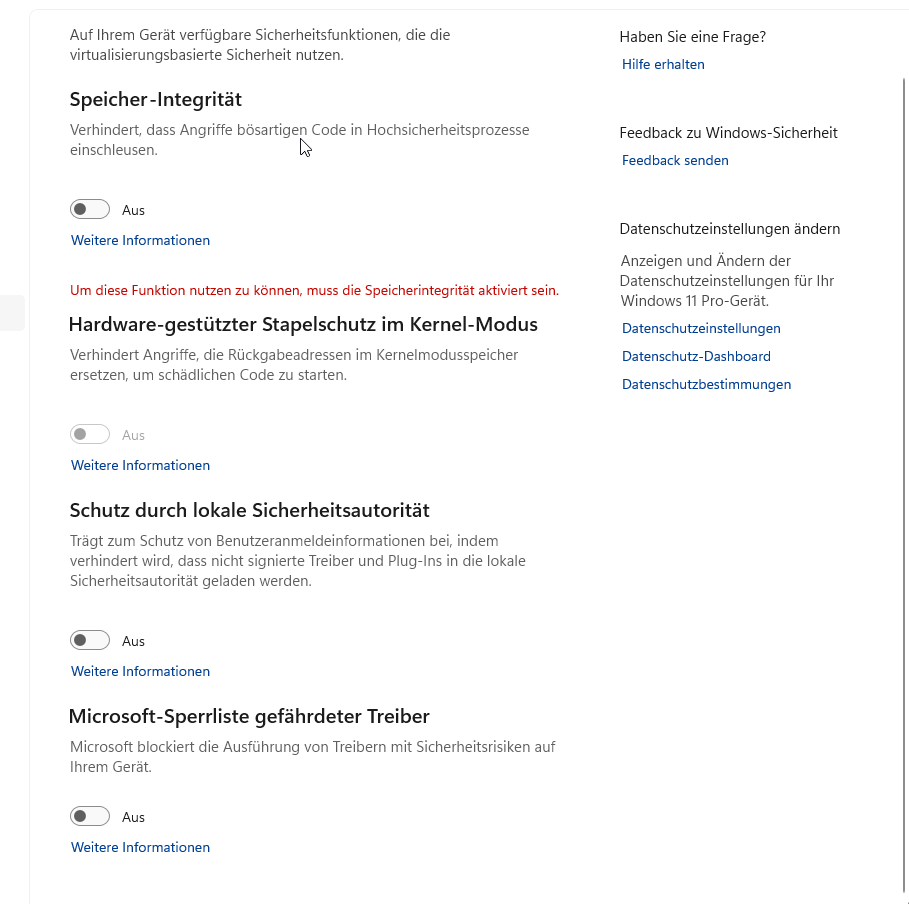 Tipp von mir: ich habe letztens einen lenovo ideapad Laptop 15,6 mit AMD 3350u hier gehabt und neu mit Win11 aufgesetzt. Mit aktivieren von Kern Isolierung meldeten plötzlich Treiber / Geräte sie gehen nicht mehr. Alle üblichen Sachen wie deinstallieren, andere Treiber, ohne Funktion. Selbst Kern Isolierung deaktivieren half nicht.
