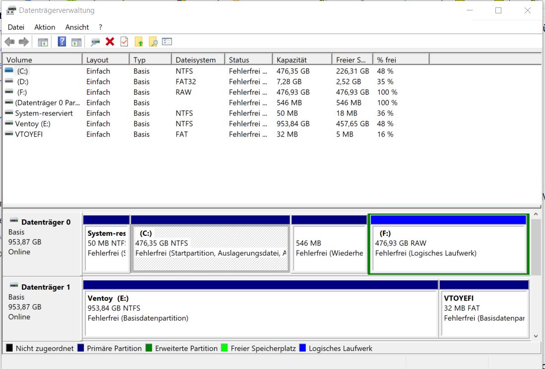 ich bräuchte mal den einen oder anderen Tipp. Ich habe gerade eine Samsung 2TB SSD von Samsung geordert und möchte sie gegen die 1TB Systemplatte tauschen (ohne Win 10 neu zu installieren). Die Laufwerke C und F (von Datenträger 0) sind mit Veracrypt verschlüsselt. Datenträger 1 wurde mit Ventoy erstellt und beherbergt alternative Bootmedien (Strelec, HBCD, Macrium Reflect, etc.)