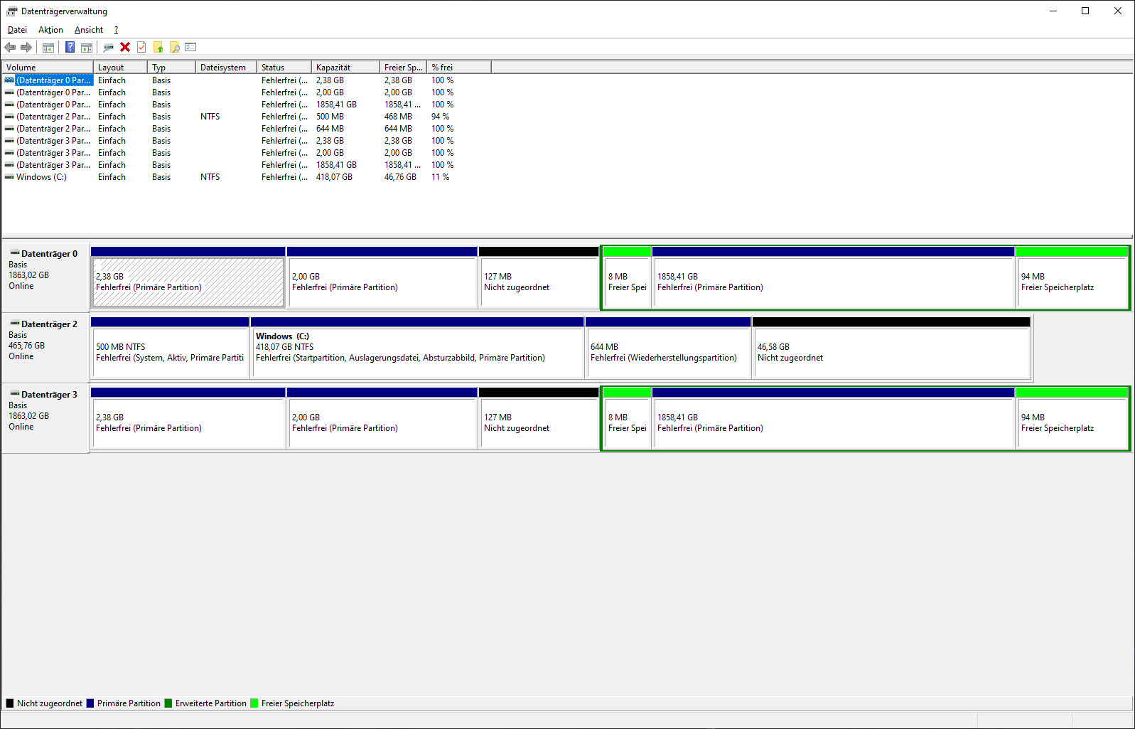 -Die letzte Möglichkeit die ich mir vorstellen könnte ist, dass ich mit den Platten ein Windows Speicherpool unter Windows 10 erstellt habe. Dort wird mir aktuell auch eine andere einzelne 4TB HDD angezeigt, aber kein Fehler oder sonstiges. Interessanterweise, kann ich diese 4TB HDD nicht ansprechen, sie wird nicht in der Datenträgerverwaltung angezeigt oder sonstiges.