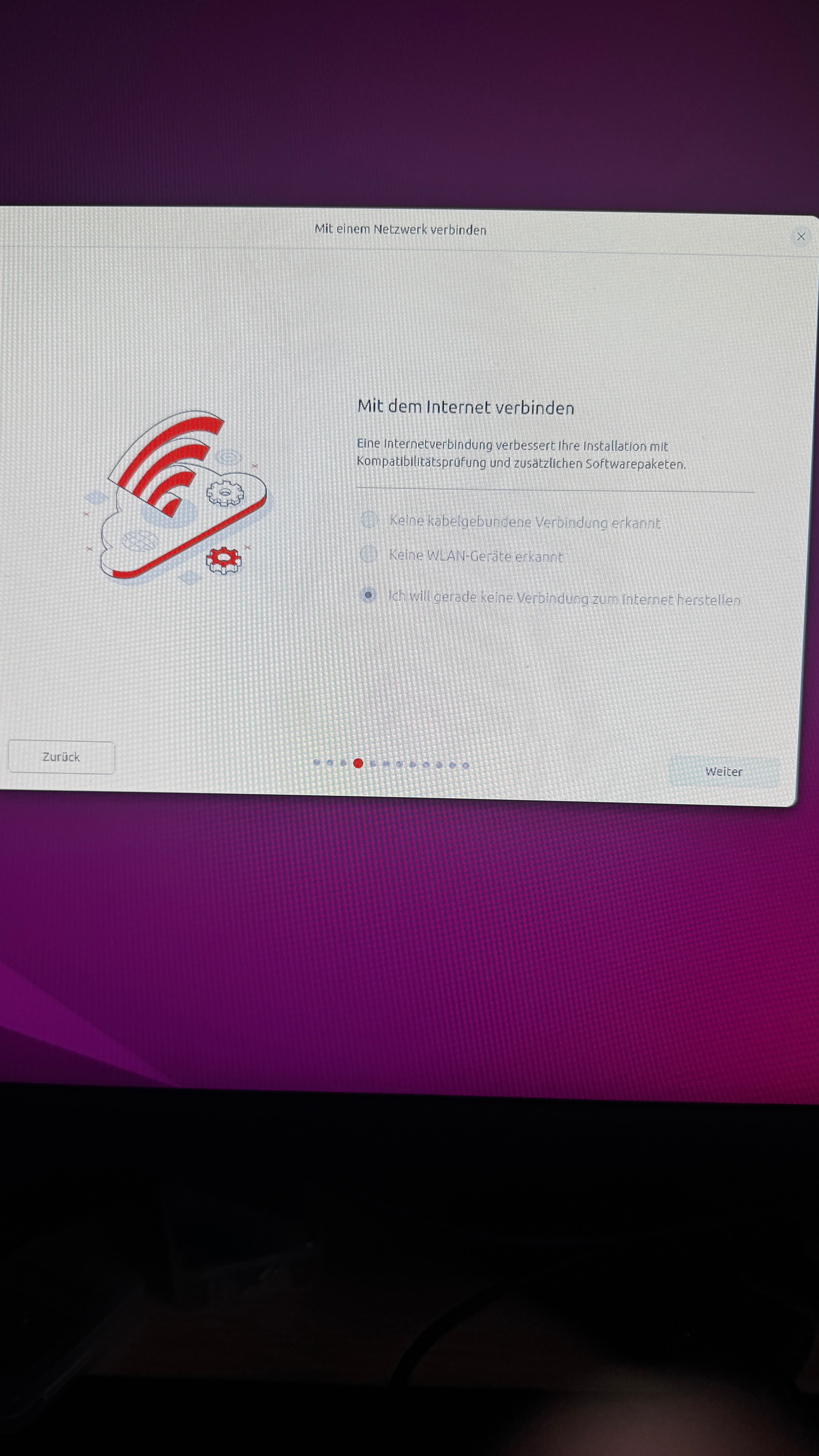 Wie man beim Setup sieht, findet Unbutu meinen Netzwerkchip nicht. Die Wlan-Verbindung auch nicht.