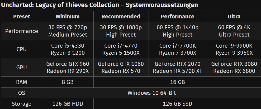 Ich finds eigenwillig, dass die empfohlenen Settings mit 30FPS@1080p schon mindestens ne 1060 brauchen. Sind das nicht +- die PS4 Settings? Und die ist ja dann doch etwas schwächer als ne 1060.