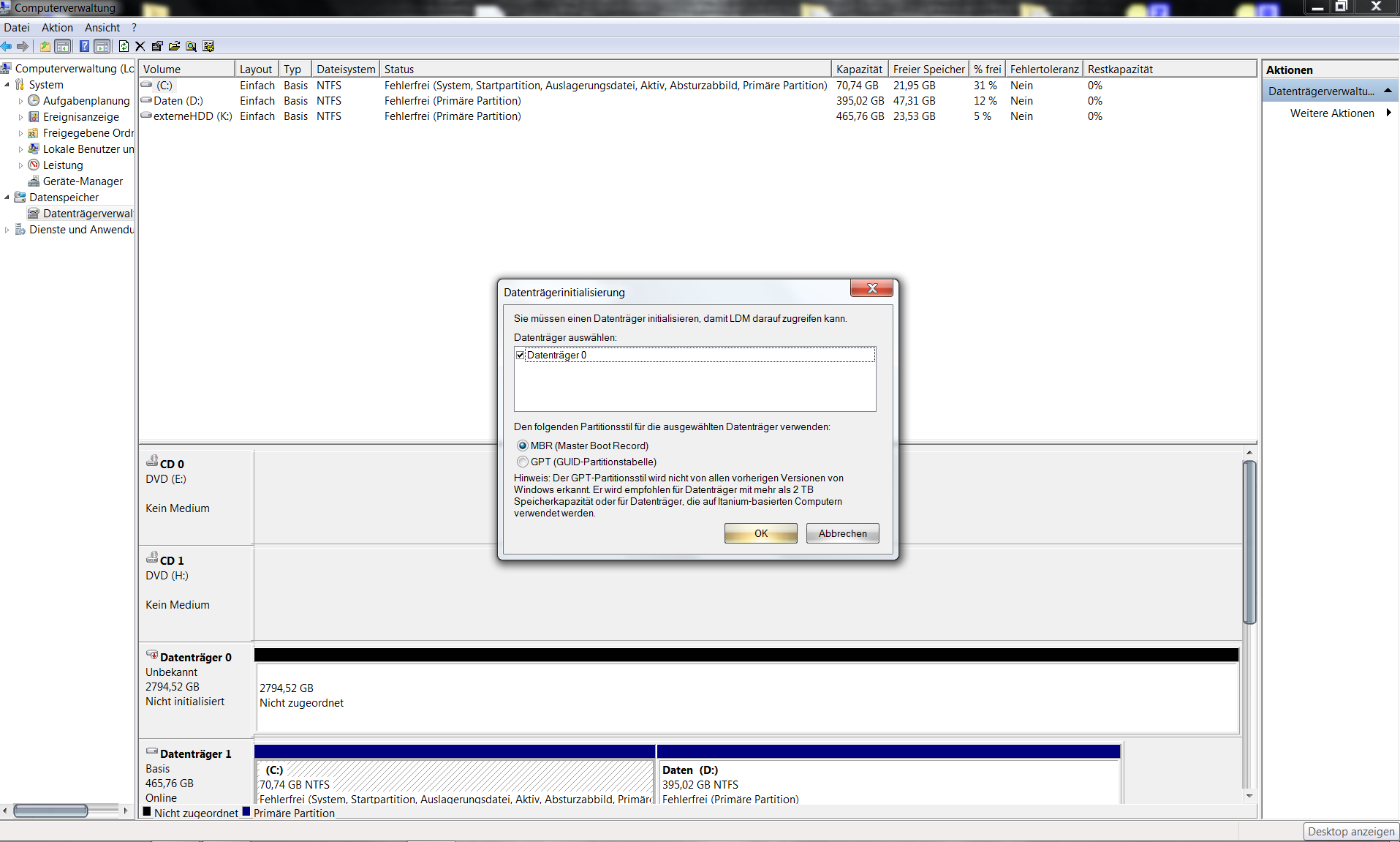 Vergewissere Dich, dass in der Datenträgerverwaltung die Platte als Datenträger1 aufscheint