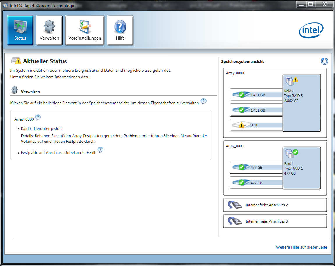 Danach ist der Array wieder im Zustand "normal" und sollte wieder den Ausfall einer beliebigen Platte verkraften.