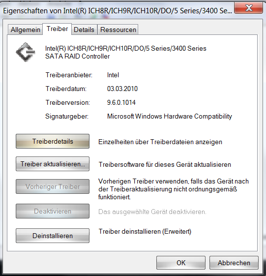 Bei Gelegenheit (kann auch erst am Abend sein) sieh mal in den Gerätemanager, und lass ihn dort am Intel-Raid-Controller anlisten, welche Treiber (Versionsdatum) Du da verwendest.