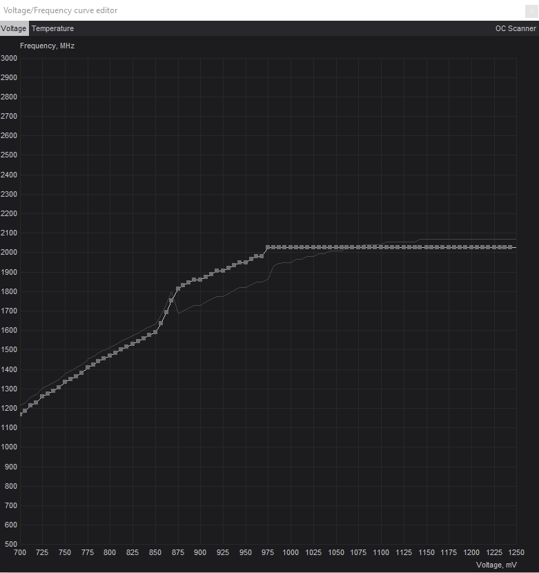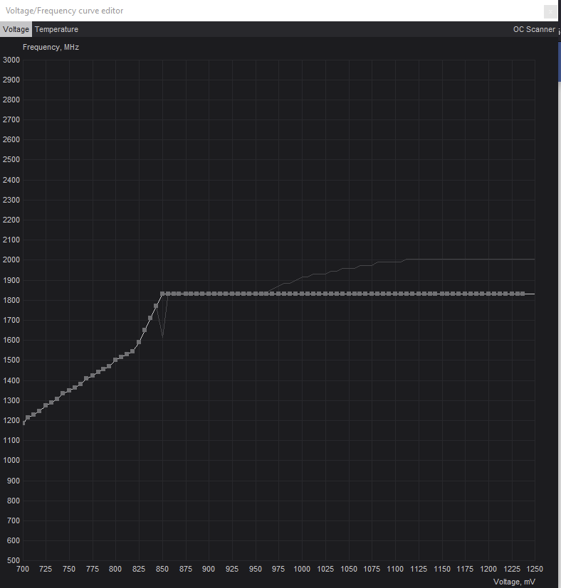 meine PNY 4080 XLR8 Gaming Verto Epic-X will nicht so undervolten wie ich es gern hätte :-) Ich halte mich an die Anleitung für den MSI Curve Editor (https://de.msi.com/blog/msi-afterburner-overclocking-undervolting-guide#undervoltingguide), kann Kurven erstellen, abspeichern usw., die Karte hält sich nur leider nicht daran, d.h. Leistungsbegrenzung scheint zu klappen, sie nimmt sich nicht mehr als 920 mV, ich komme aber nicht darunter. Die Karte läuft nie unter 920 mV, sie hält sich nicht an die Kurve. Denkfehler, Bedienungsfehler, normales Verhalten der Karte?