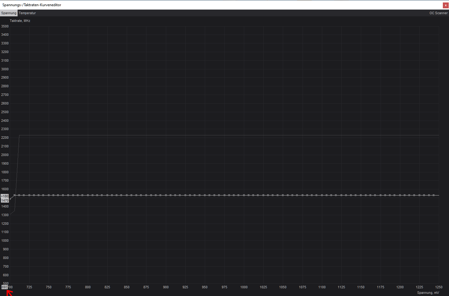 Das ist quasi mein Undervolting-Profil, wie man sieht liegt der niedrigste Punkt auf 693 mV bei 1470 MHz. Ich hatte es auch noch mit 600 mV (nicht mit 1470 MHz) anstatt 700 mV versucht, aber da gerate ich ab einem bestimmten Punkt (zwischen ca. 650 mV und 670 mV) in einen Konflikt mit den BIOS Einstellungen meiner Grafikkarte, und ich habe es auch nicht stabil bekommen so das sich Undervolting in dem Bereich bei mir gelohnt hätte.^^