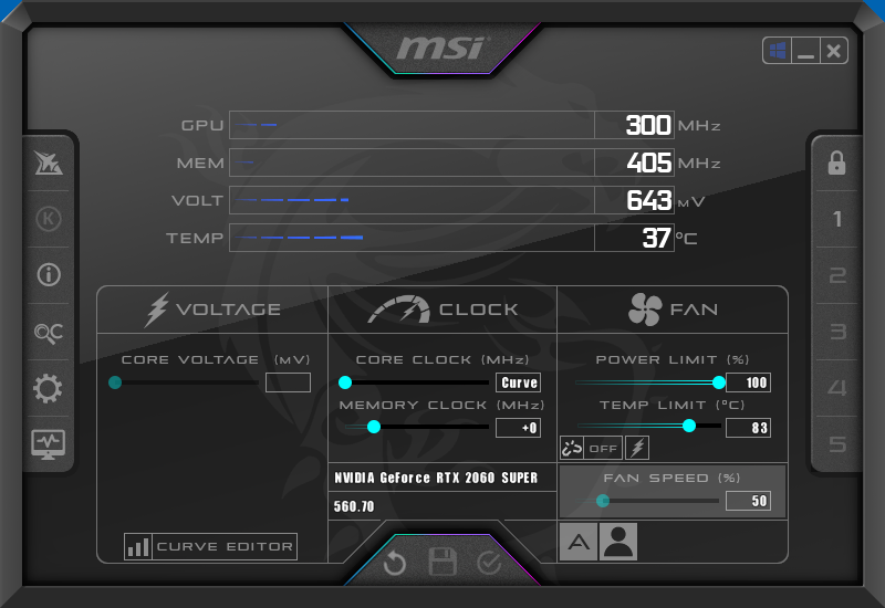 Nur als Information, man kann für MSI Afterburner wenn man die Zugriffsrechte der Config-Datei anpasst, die minimale mV senken, allerdings führt das zu Problemen wenn man keine Begrenzung der Taktfrequenz haben will bzw. Übertakten möchte, man kann also leider nicht gleichzeitig ein Profil für Undervolting und eines für Overclocking haben, also im AB haben kann man es schon, nur sind dann die mV Werte für die hohen Taktfrequenzen zu niedrig, zumindest bei mir.^^