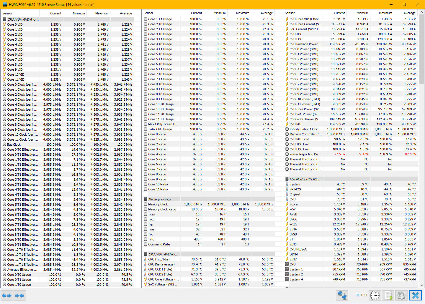 So habe gerade mal die Werte im neuen Beta Bios übernommen aber an meine alte Werte komme ich nicht mehr ran. Ob es am neuen Bios liegt oder was falsch gesetzt kann ich nicht sagen. Vorher hatte ich immer über etwas über 7200 im CB20, jetzt immer unter 7200. Anbei die hwinfo, vielleicht sieht ja wer wo das Problem liegt. Temps sind alle grün gewesen.
