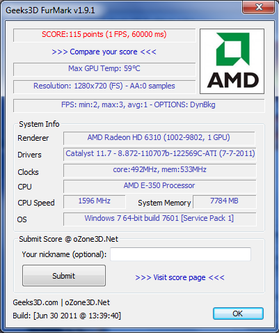 Laut Aida64 taktet bei mir die HD 6310 auf 497Mhz hoch unter Last. Mit welchen Einstellungen testet Ihr im Furmark? Ich komme da nämlich nur auf 2-3FPS ...