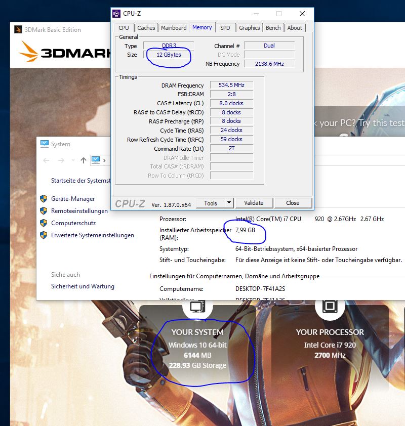 Es kam mit 3x 2GB 1066er Samsung DDR3 für Triplechannel. Ich habe dann aus dem Fundus 1x GSkill 1333 4GB und 1x noname 1333 2GB dazugesteckt wie folgt: