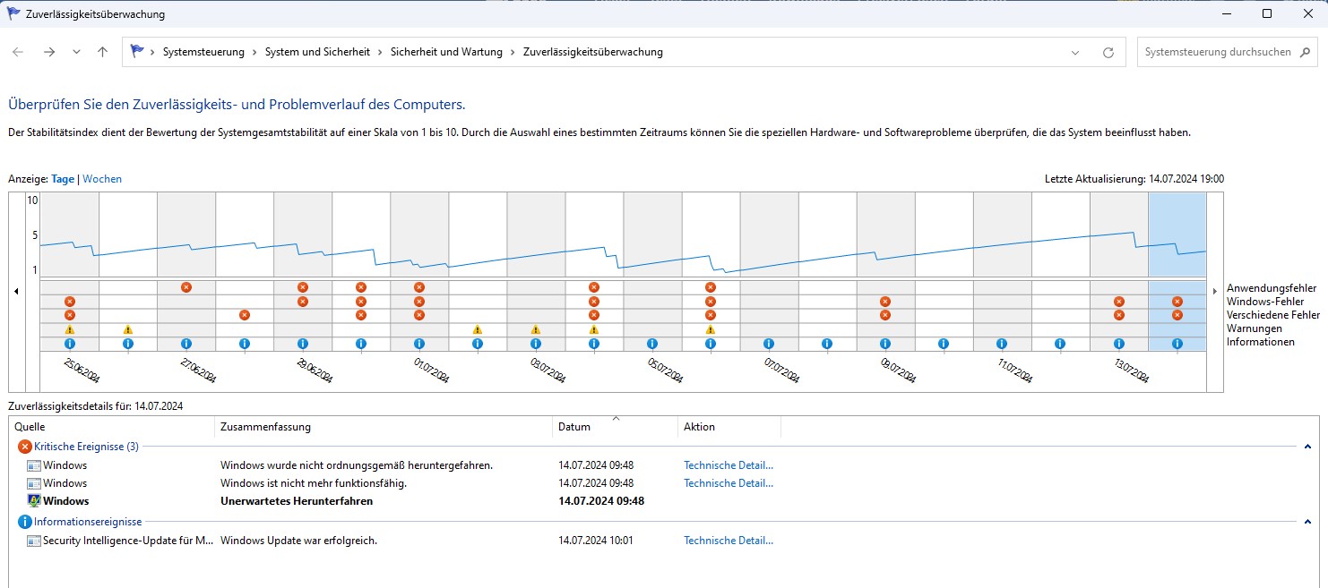 Es treten seit Zusammenbau des Rechners im Dezember 2023 immer wieder Abstürze in Windows auf, teilweise mehrmals am Tag, teilweise jeden 2. Tag. Eine Weile war es besser, danach ging es wieder los. Ich habe hier keine wesentlichen Änderungen durchgeführt, es ging plötzlich wieder los.