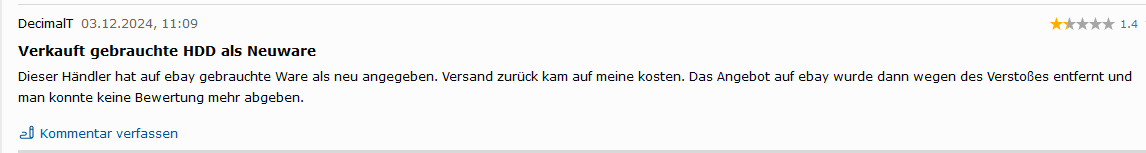 Es gibt auch keinen Hinweis darauf, dass recertified HDDs weniger zuverlässig sind als neue HDDs. Bei neuen HDDs kann man, je nach Batch, auch von 10% Ausfallrate innerhalb der ersten Tage oder gar Stunden ausgehen. Wenn man viele kauft, dann ist das Statistik. Wenn man eine kauft, dann ist es Glücksspiel ob die die ersten drei Tage überlebt. Deswegen macht man mit neuen und recertified HDDs auch immer einen Burn In.