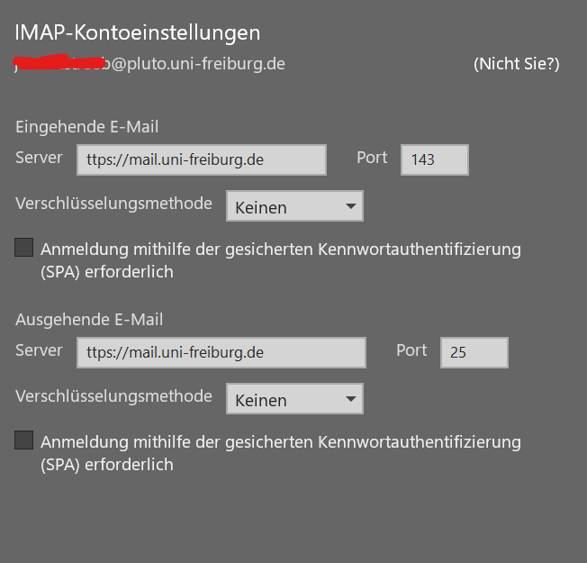 Dieser Zugangspunkt wird ebenso für Mailclients verwendet. Als Servername ist mail.uni-freiburg.de einzutragen, der Benutzername ist die vollständige Mailadresse, das Passwort ist wie gehabt. Die Kollegin aus der Anglistik muss als Benutzernamen jeanette.doe@anglistik.uni-freiburg.de eintragen.